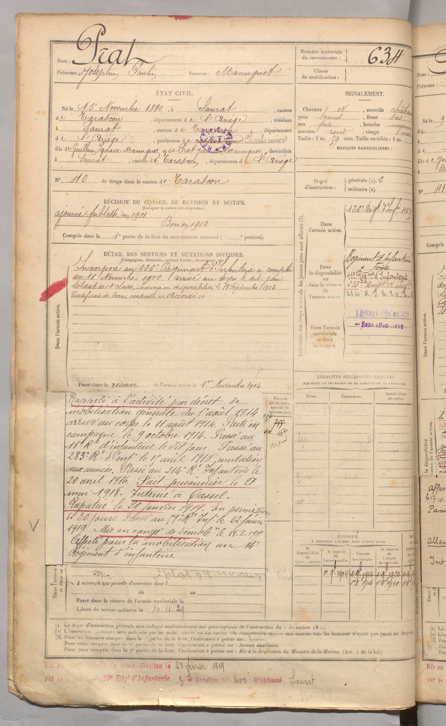 | Prat | Josephin Paulin dit Manuguet | FOIX | 129 W 3 | 1900 | Saurat | Saurat | 634 |