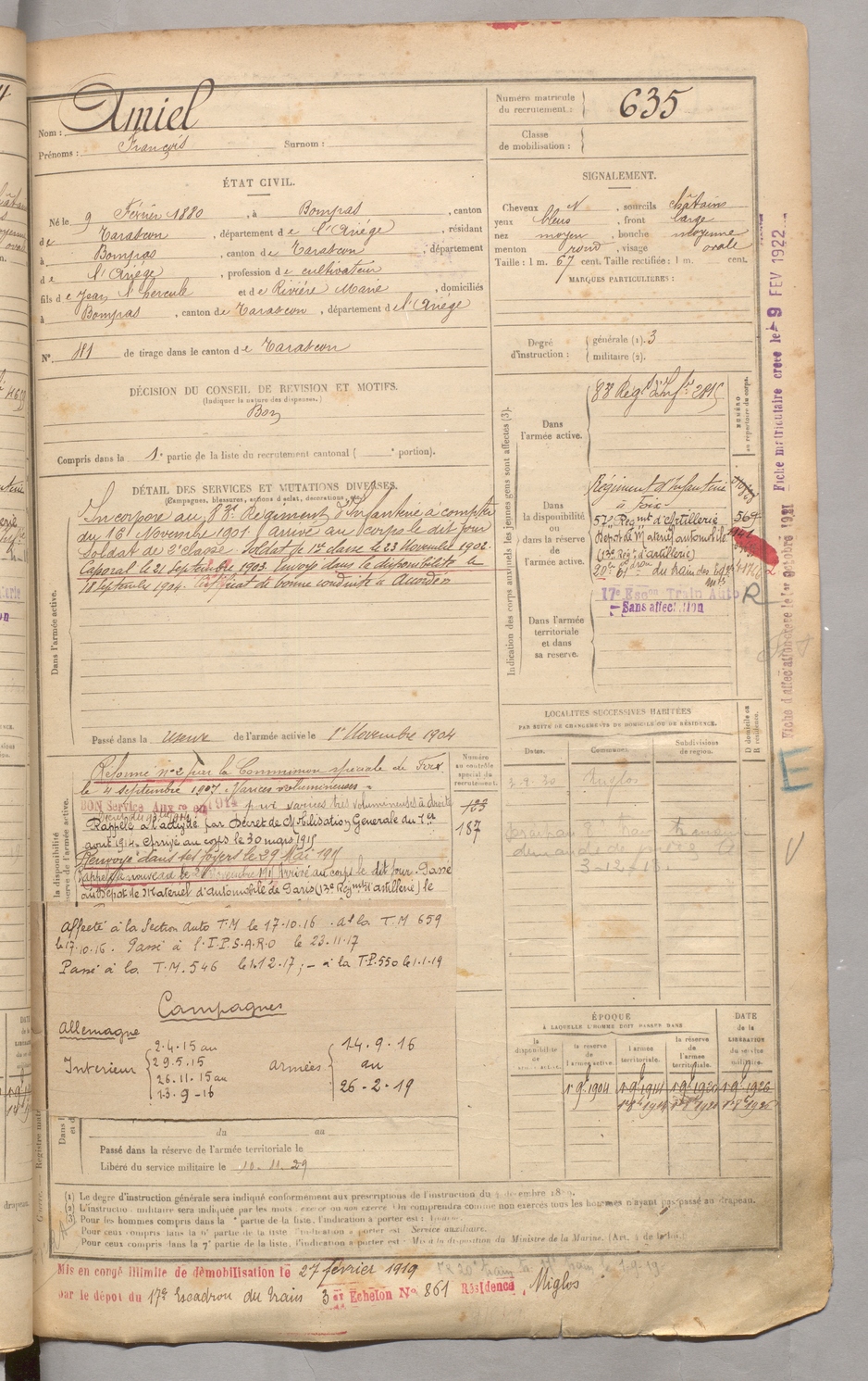 | Amiel | François | FOIX | 129 W 3 | 1900 | Bompas | Bompas | 635 |
