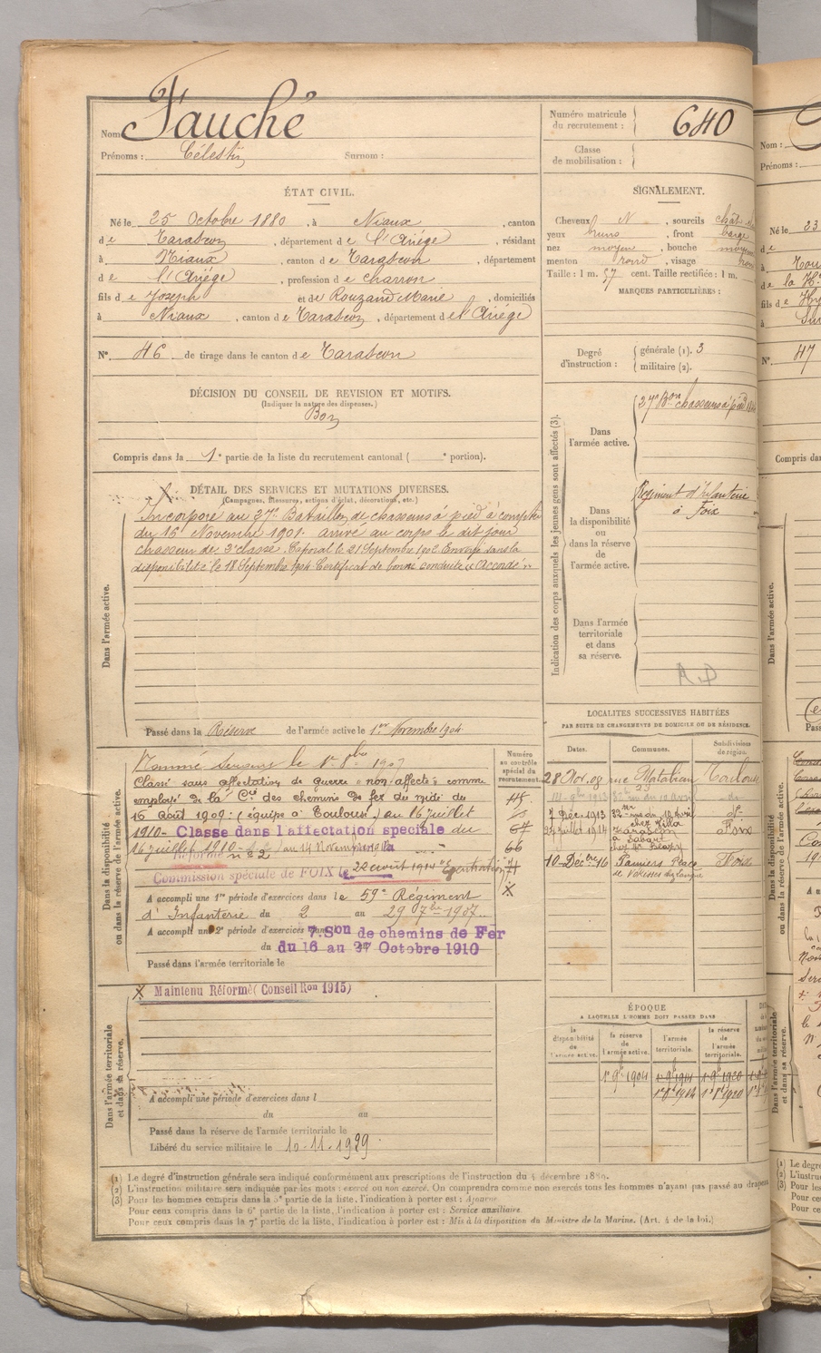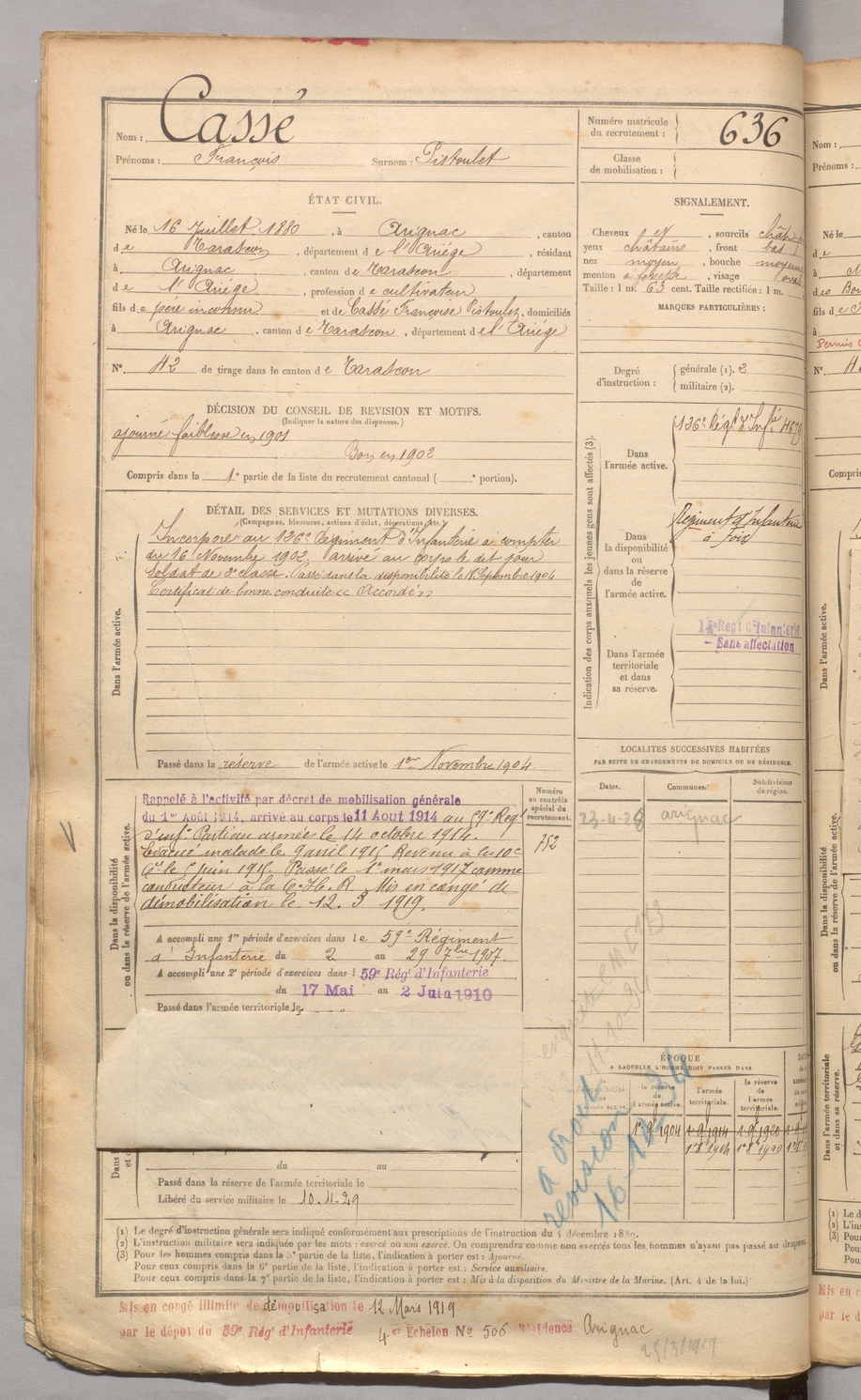| Cassé | François dit Pistoulet | FOIX | 129 W 3 | 1900 | Arignac | Arignac | 636 |