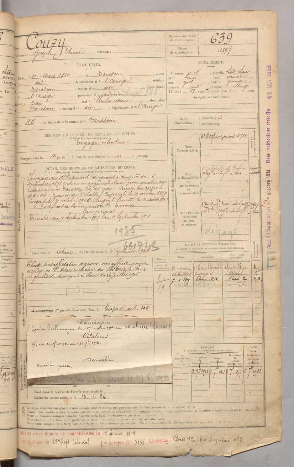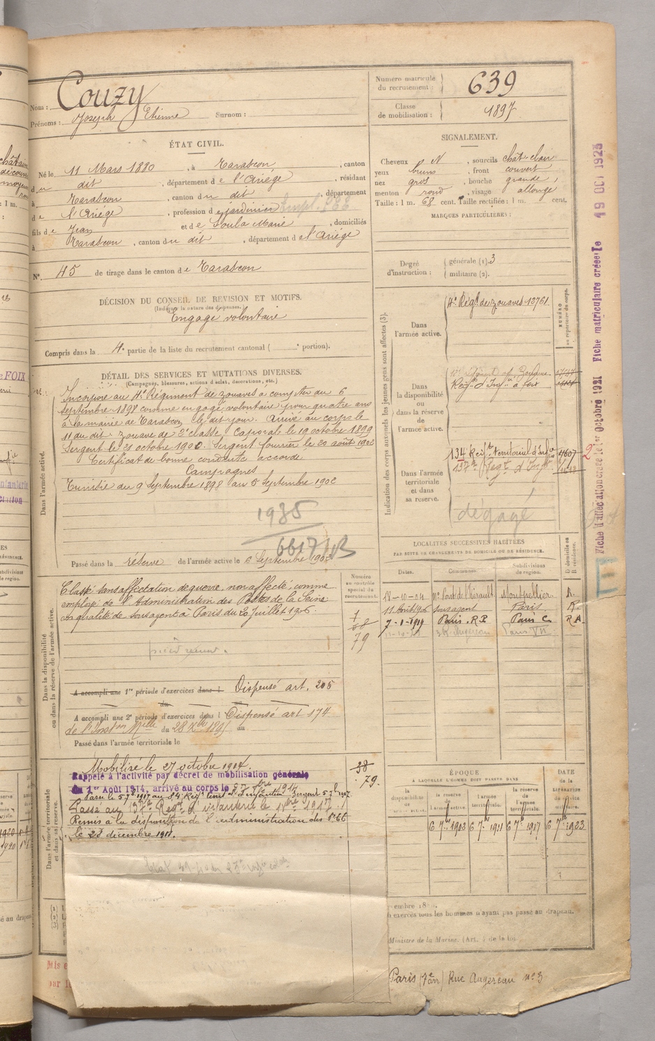 | Couzy | Joseph Etienne | FOIX | 129 W 3 | 1900 | Tarascon | Tarascon | 639 |