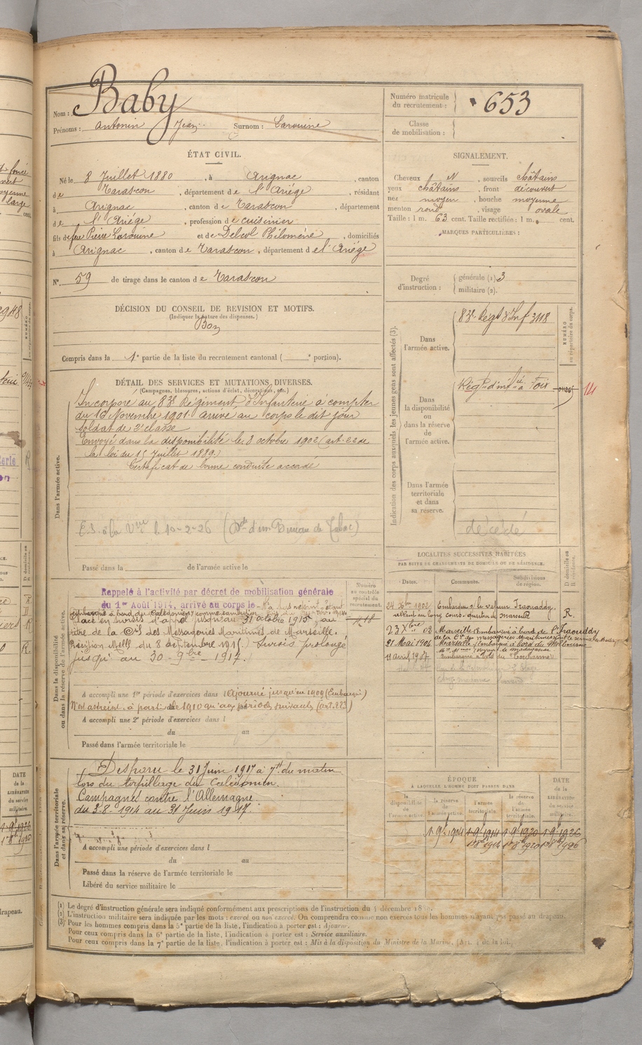 | Baby | Antonin Jean dit Larouine | FOIX | 129 W 3 | 1900 | Arignac | Arignac | 653 |