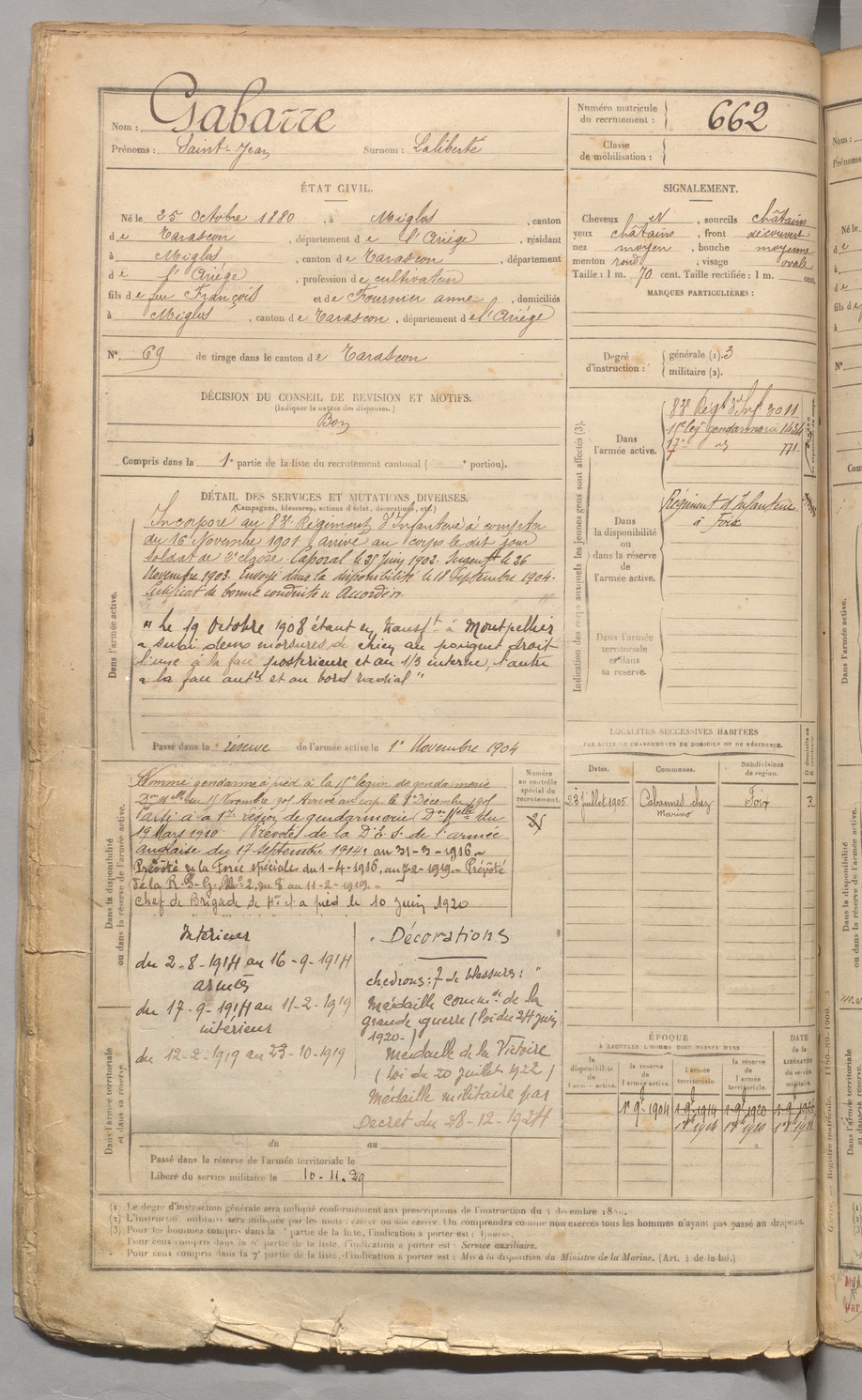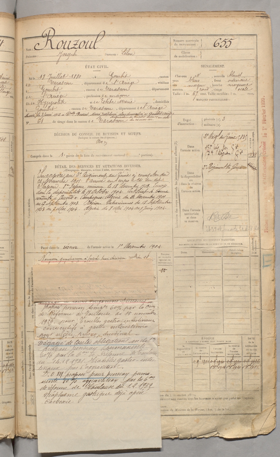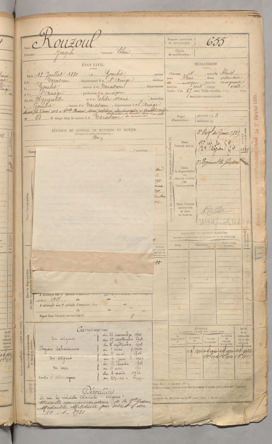 | Rouzoul | Joseph dit Lélou | FOIX | 129 W 3 | 1900 | Gourbit | Gourbit | 655 |