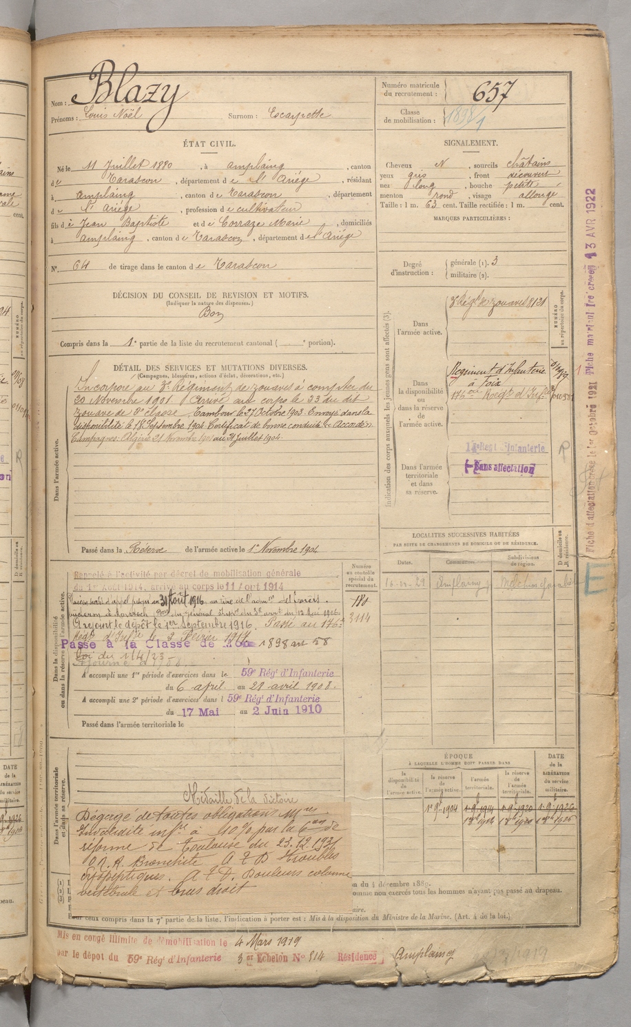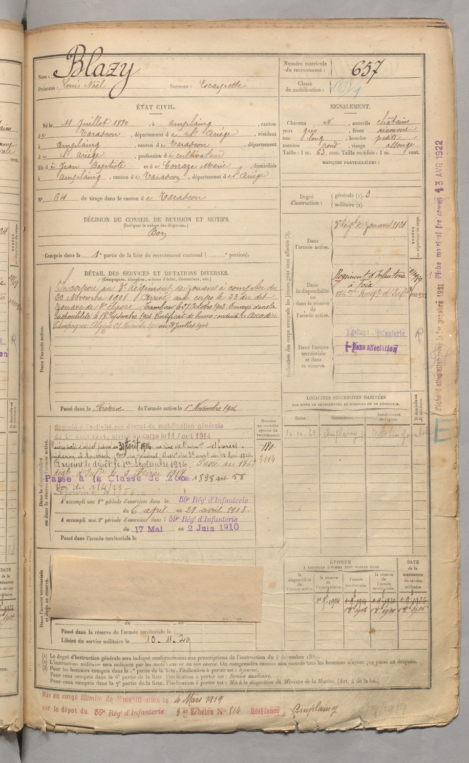 | Blazy | Louis Noël dit Escarpette | FOIX | 129 W 3 | 1900 | Amplaing | Amplaing | 657 |
