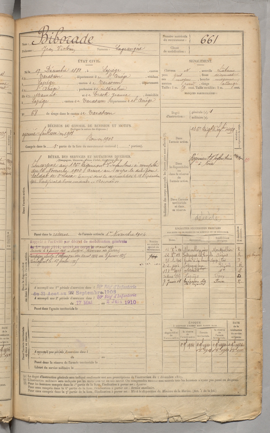 | Biborade | Jean Victorin dit Lagrangère | FOIX | 129 W 3 | 1900 | Lapège | Lapège | 661 |