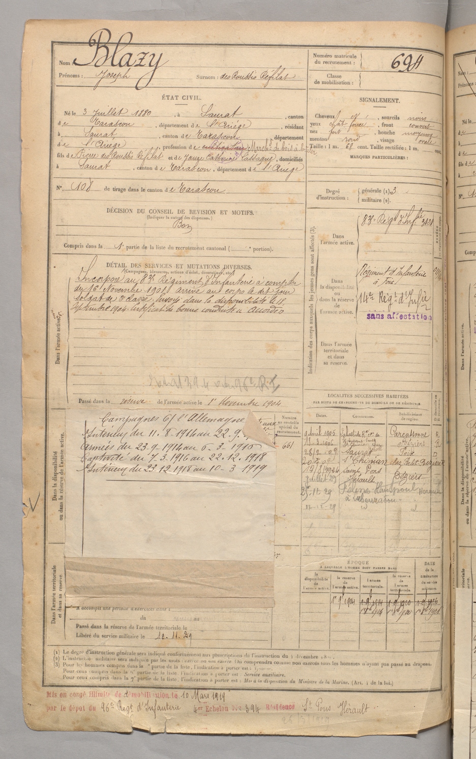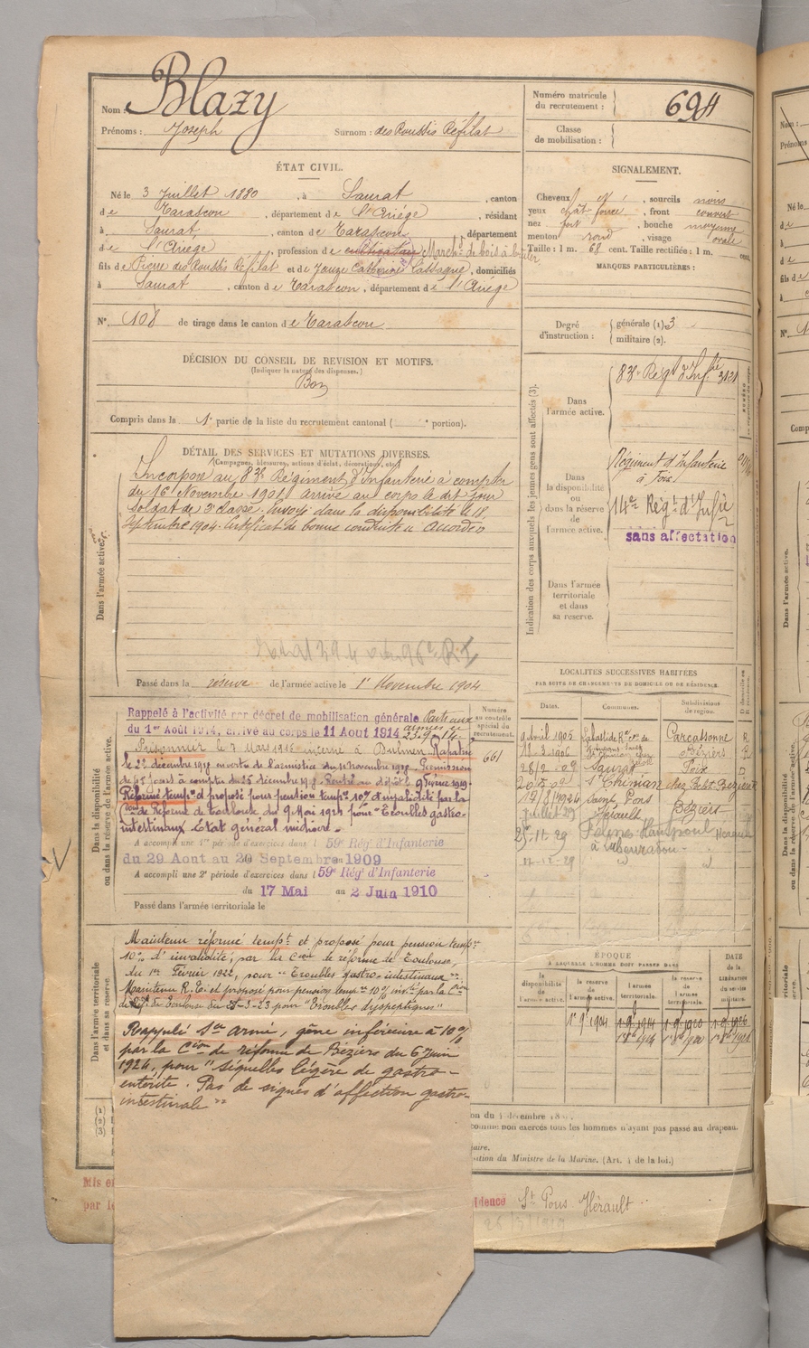 | Blazy | Joseph dit des Roussis Réfilat | FOIX | 129 W 3 | 1900 | Saurat | Saurat | 694 |