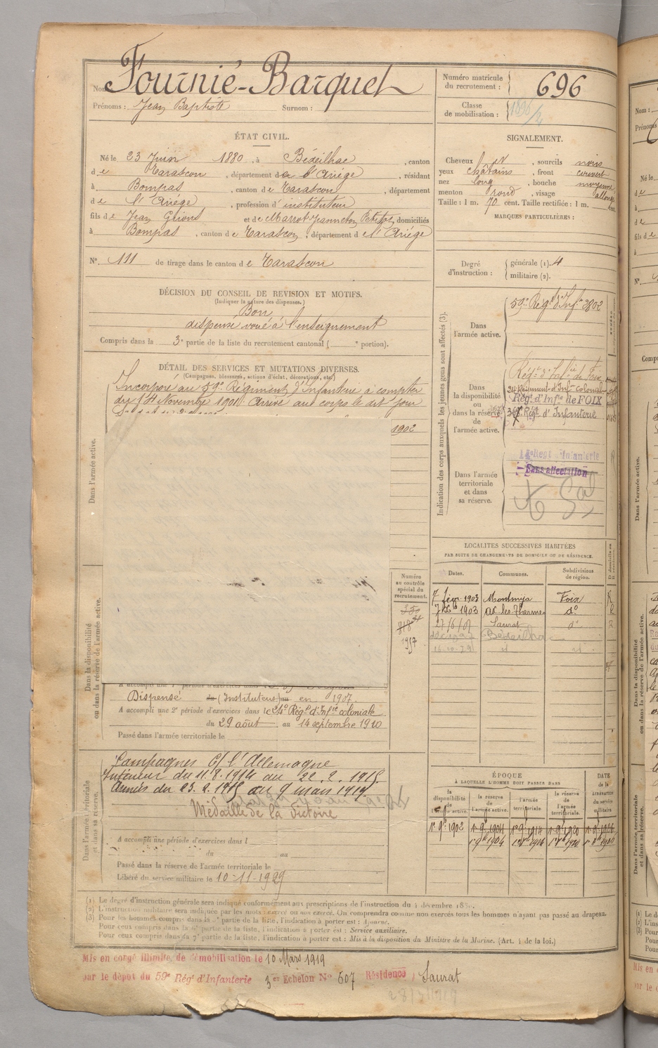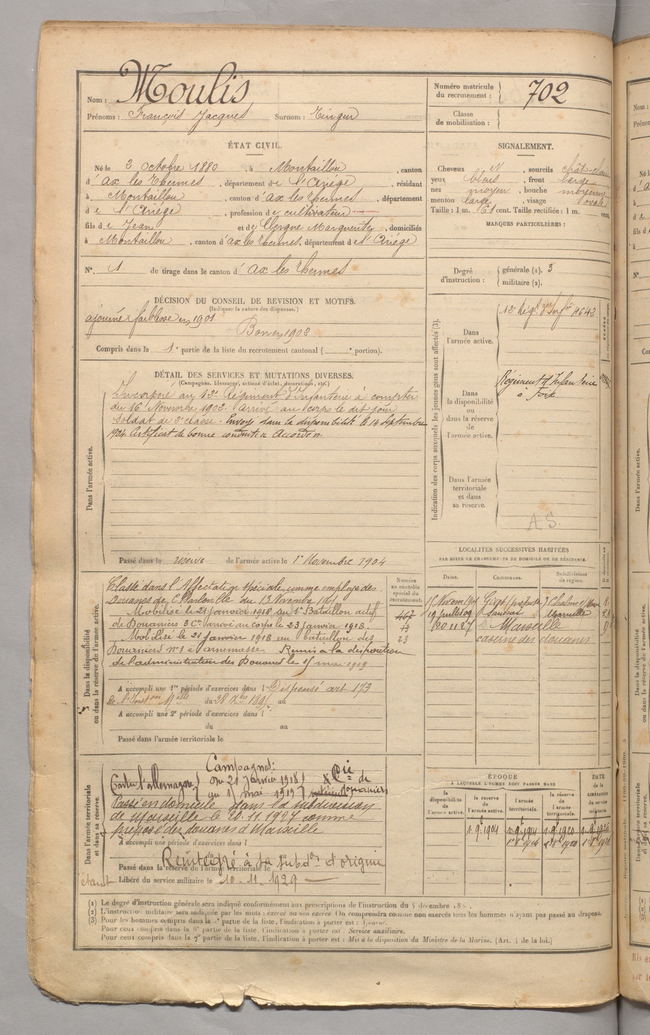 | Moulis | François Jacques dit Tingur | FOIX | 129 W 3 | 1900 | Montaillou | Montaillou | 702 |