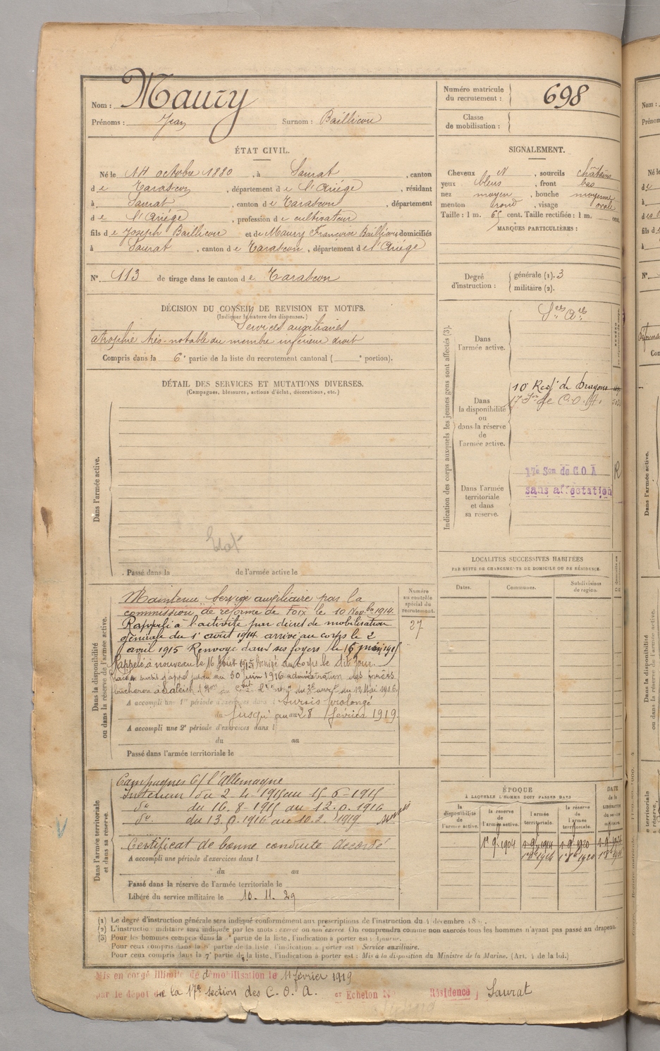 | Maury | Jean dit Baillicou | FOIX | 129 W 3 | 1900 | Saurat | Saurat | 698 |