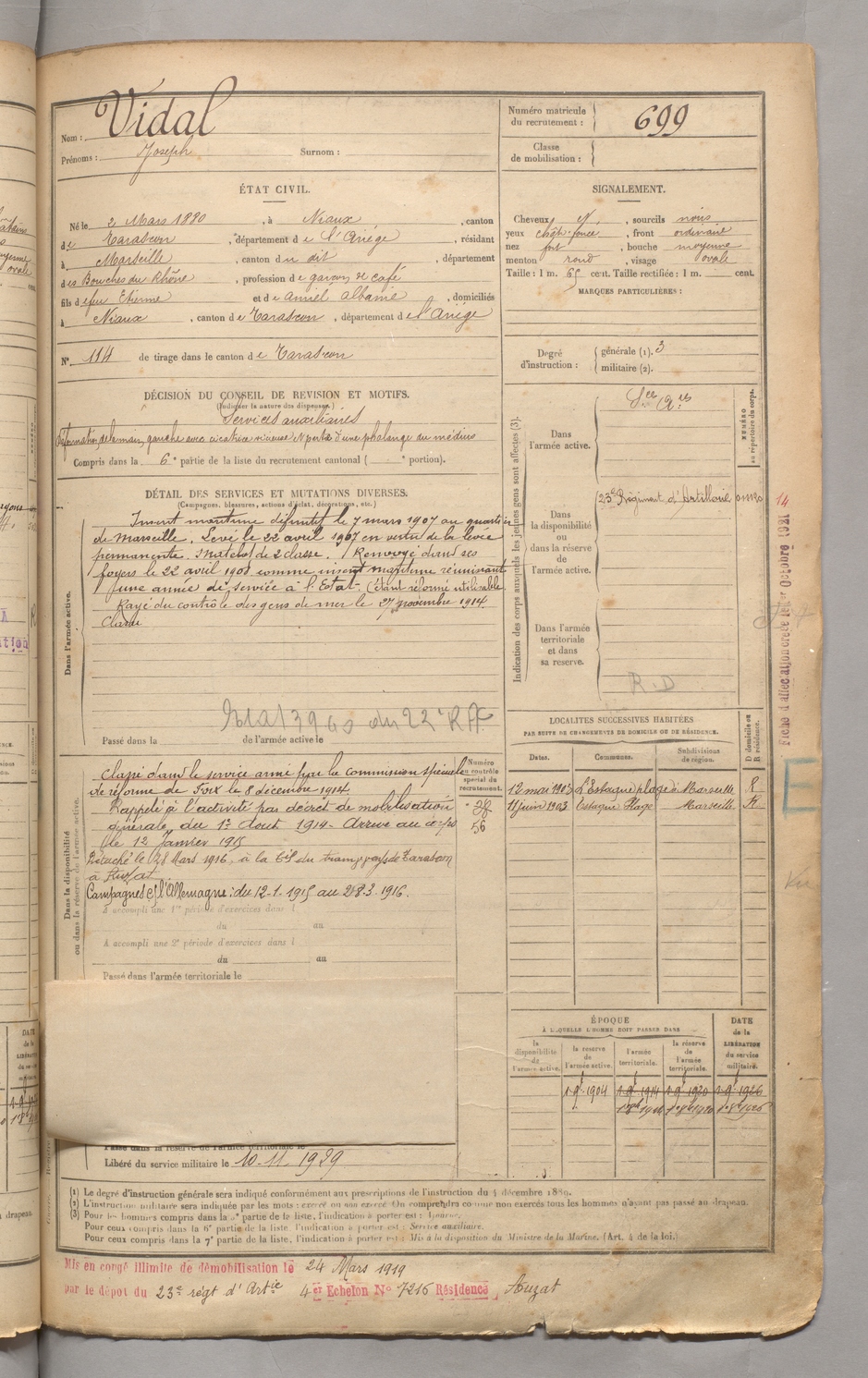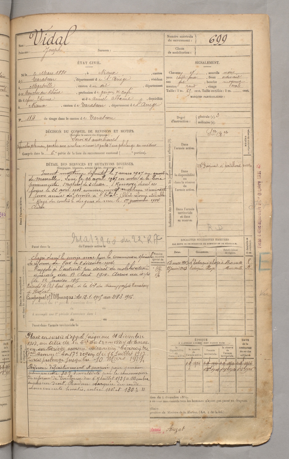 | Vidal | Joseph | FOIX | 129 W 3 | 1900 | Niaux | Marseille | 699 |
