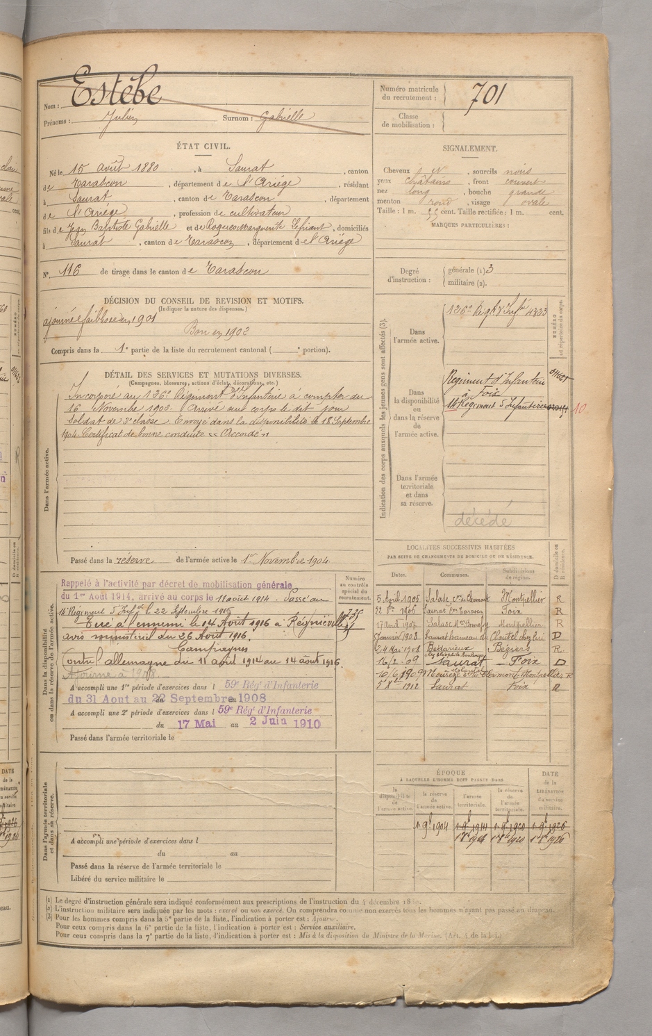 | Estèbe | Julien dit Gabrielle | FOIX | 129 W 3 | 1900 | Saurat | Saurat | 701 |