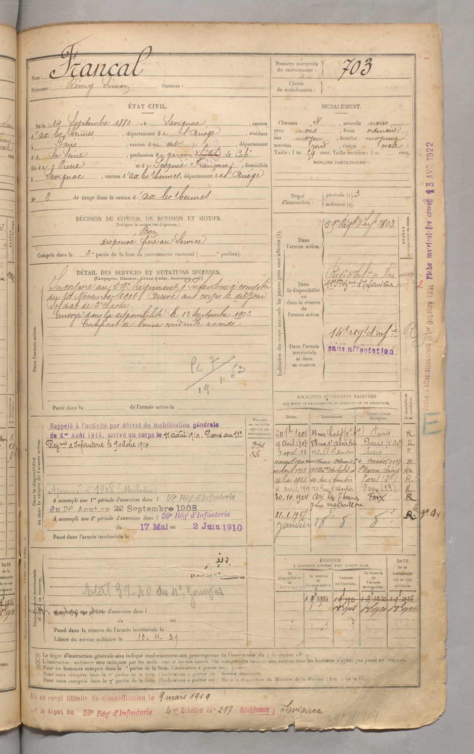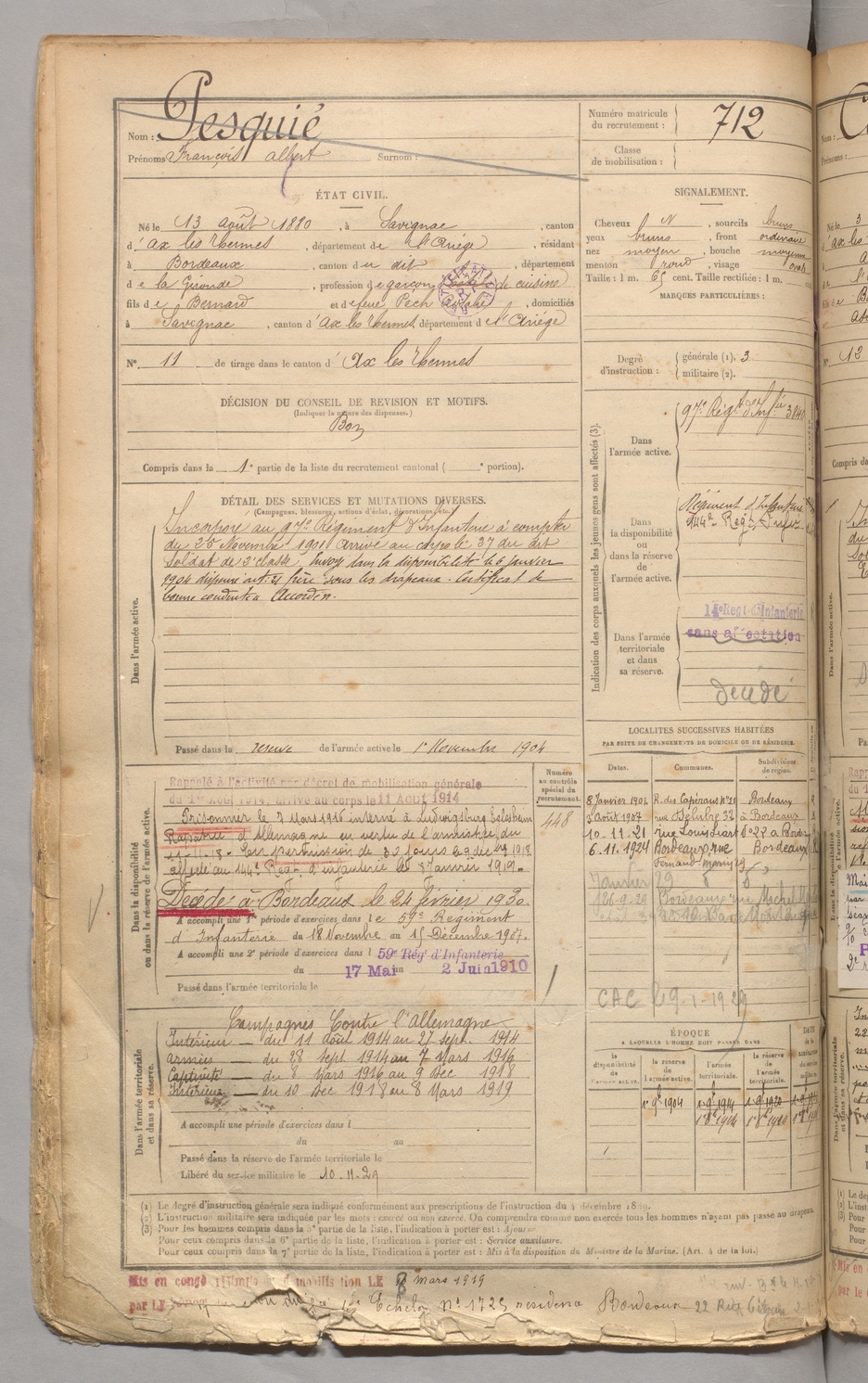 | Pesquié | François Albert | FOIX | 129 W 3 | 1900 | Savignac-les-Ormeaux | Bordeaux | 712 |