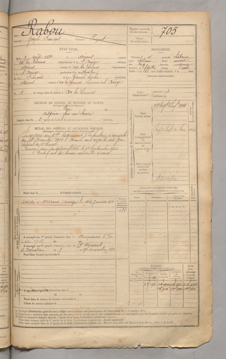 | Rabou | Joseph François dit Piquet | FOIX | 129 W 3 | 1900 | Mérens-les-Vals | Mérens-les-Vals | 705 |