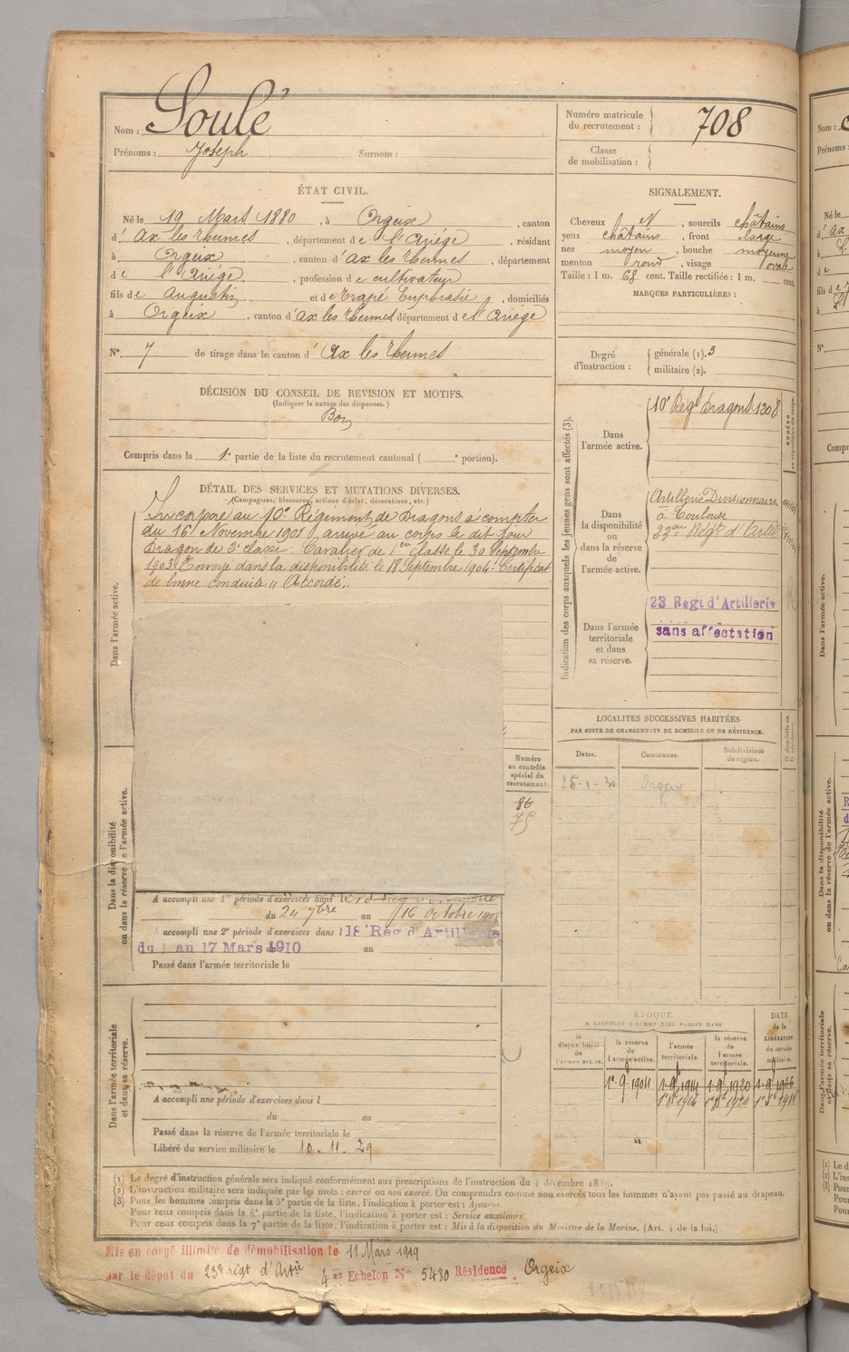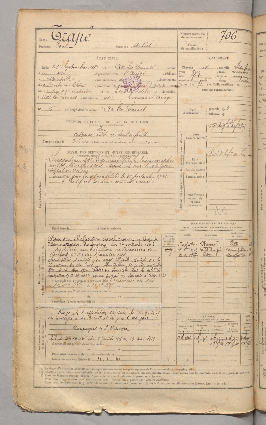 | Trapé | Paul dit Matriet | FOIX | 129 W 3 | 1900 | Ax-les-Thermes | Marseille | 706 |