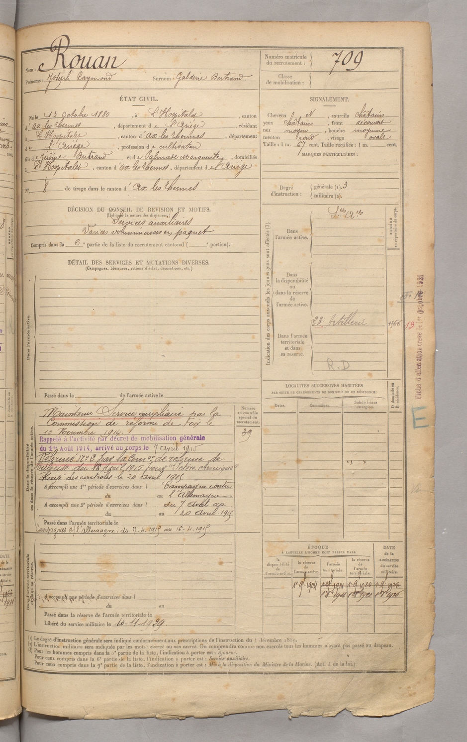 | Rouan | Joseph Raymond dit Galderie Bertrand | FOIX | 129 W 3 | 1900 | Hospitalet (L') | Hospitalet (L') | 709 |