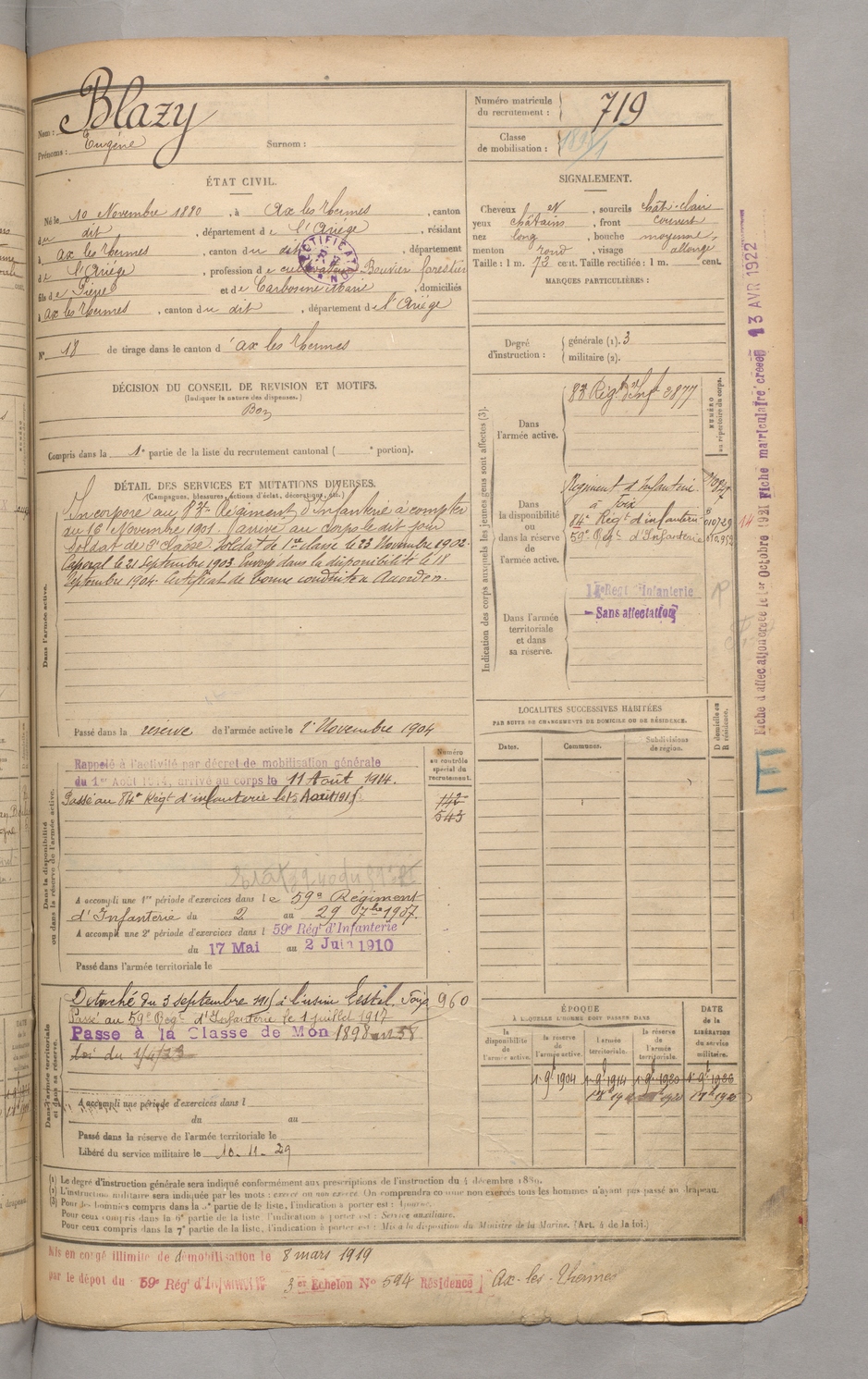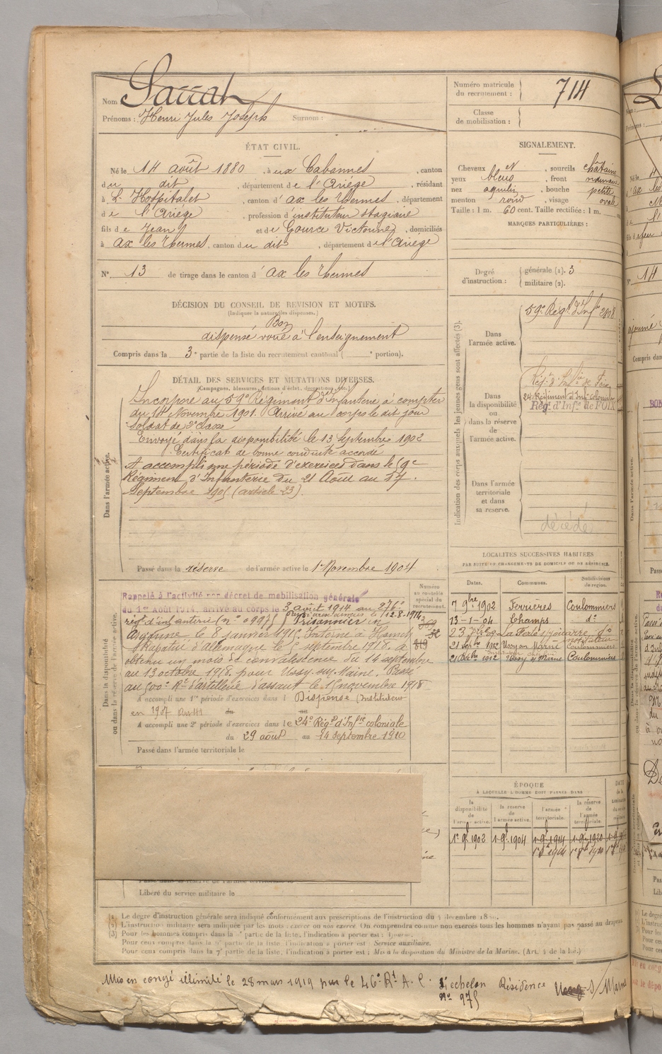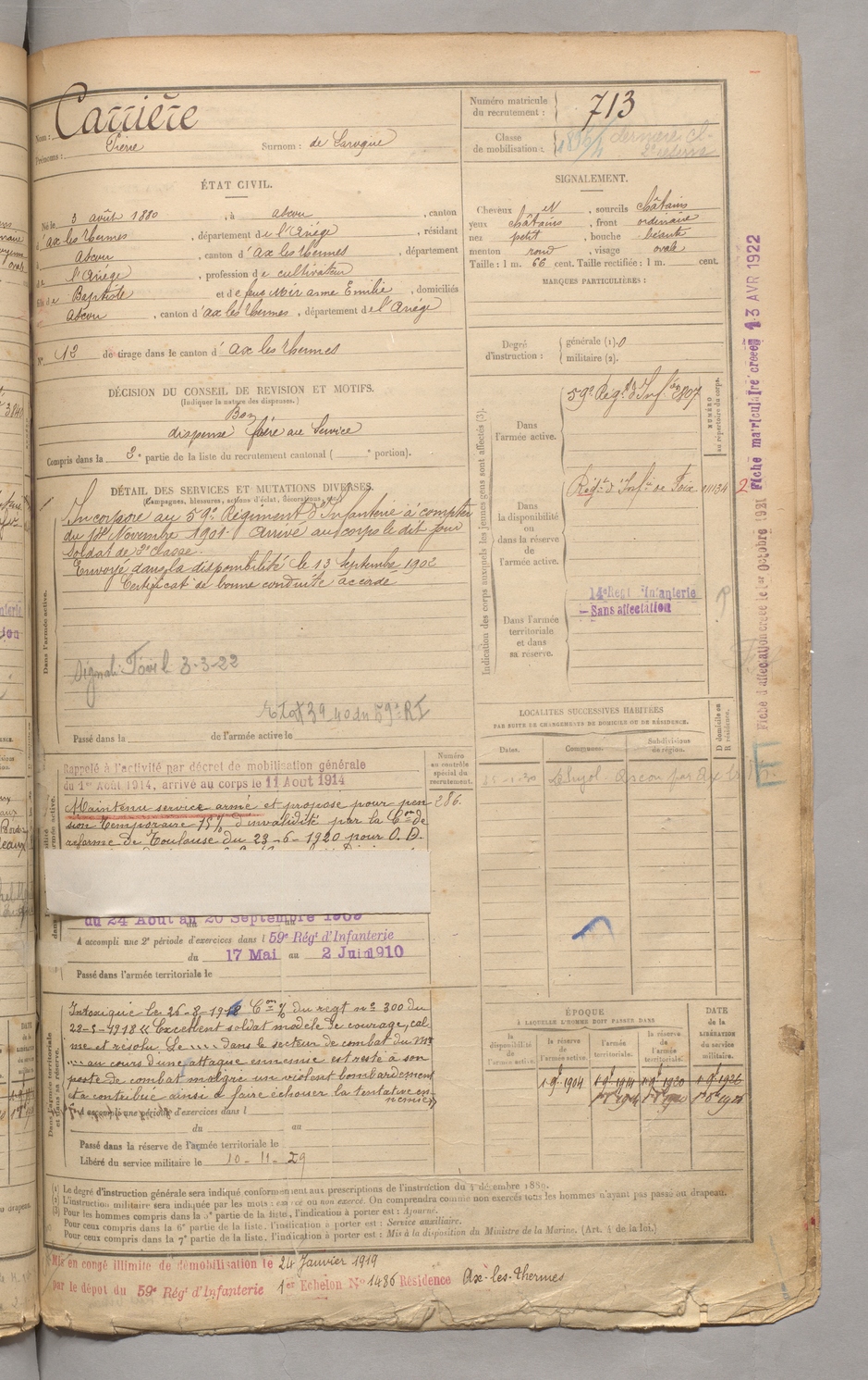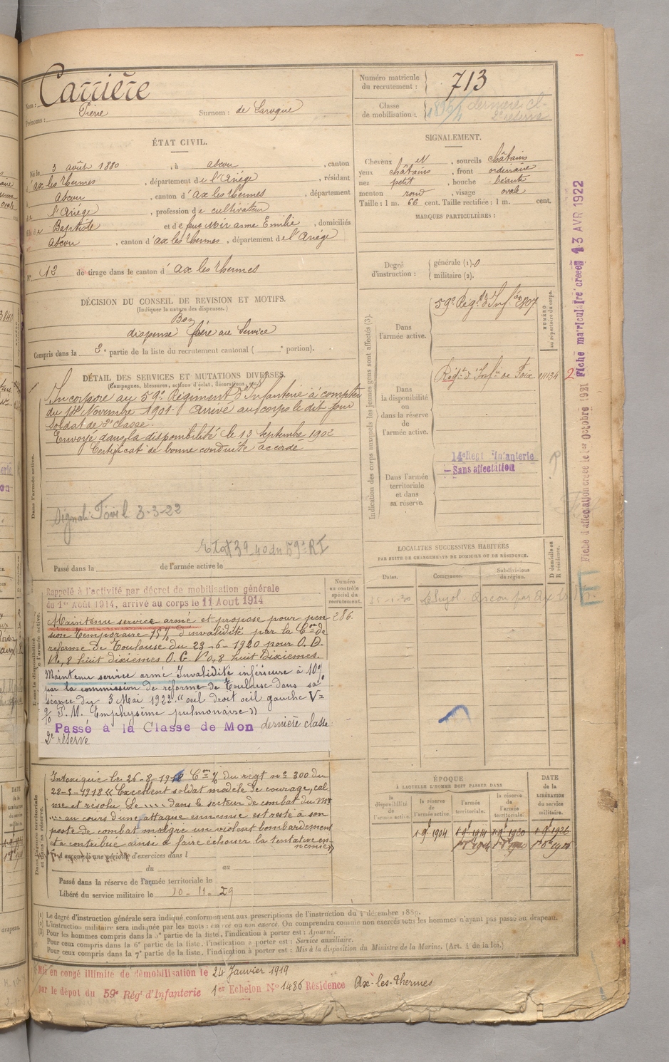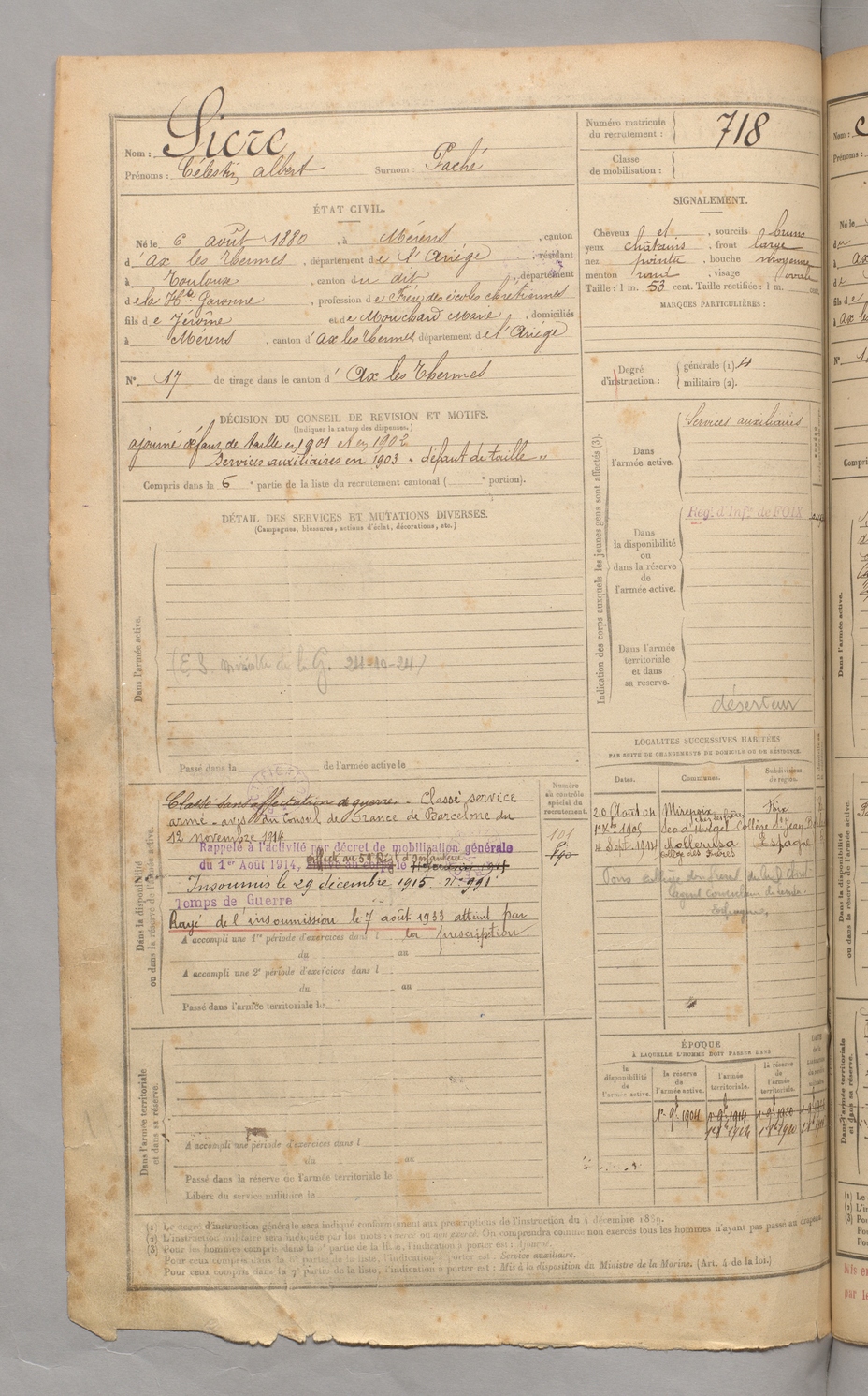 | Sicre | Célestin Albert dit Paché | FOIX | 129 W 3 | 1900 | Mérens-les-Vals | Toulouse | 718 |
