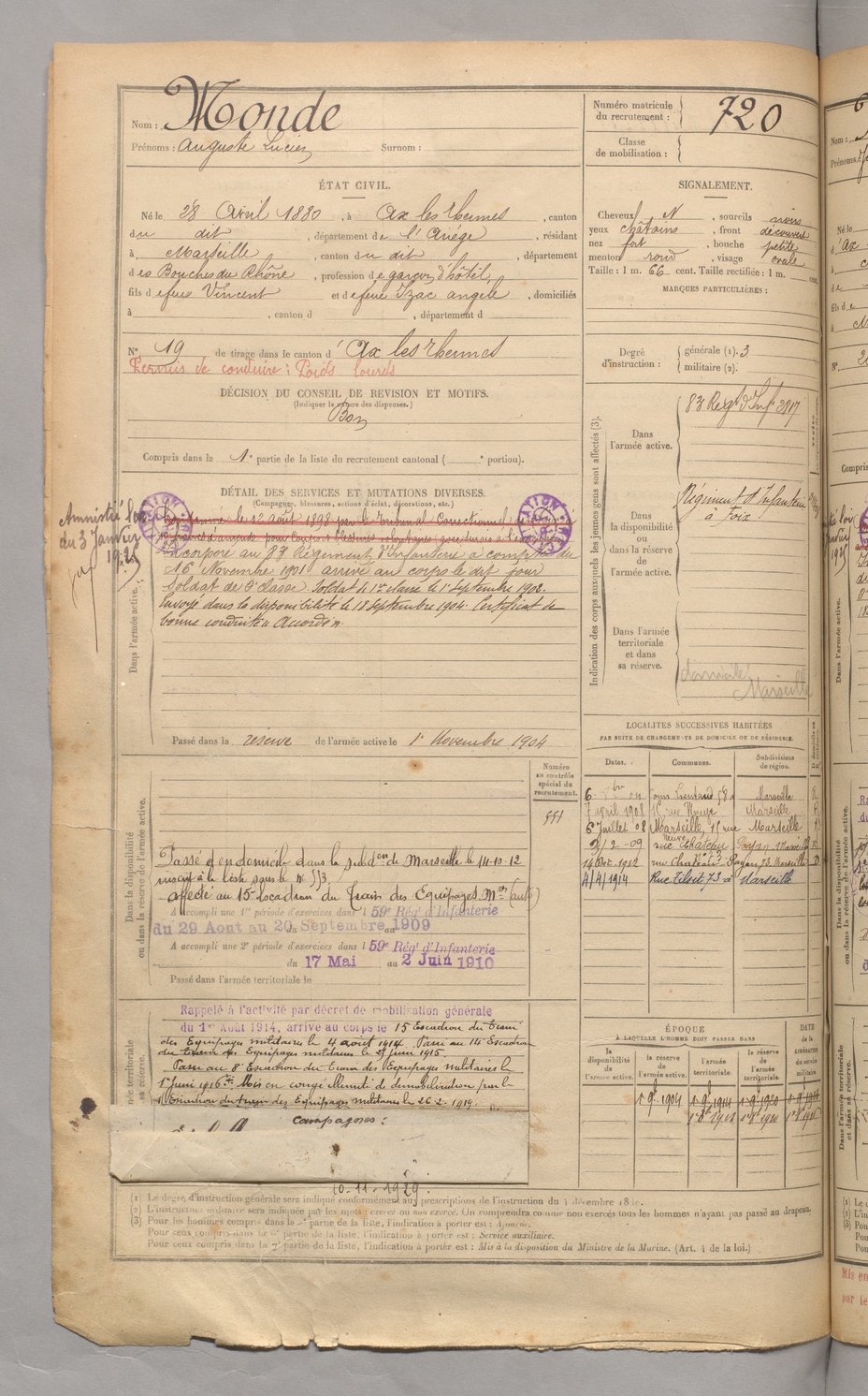 | Monde | Auguste Lucien | FOIX | 129 W 3 | 1900 | Ax-les-Thermes | Marseille | 720 |