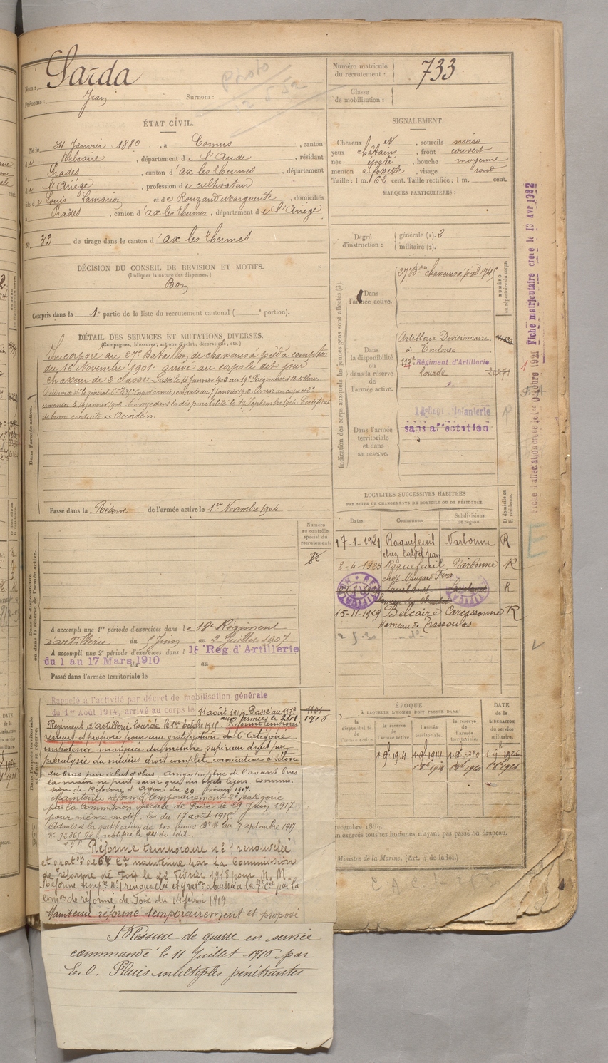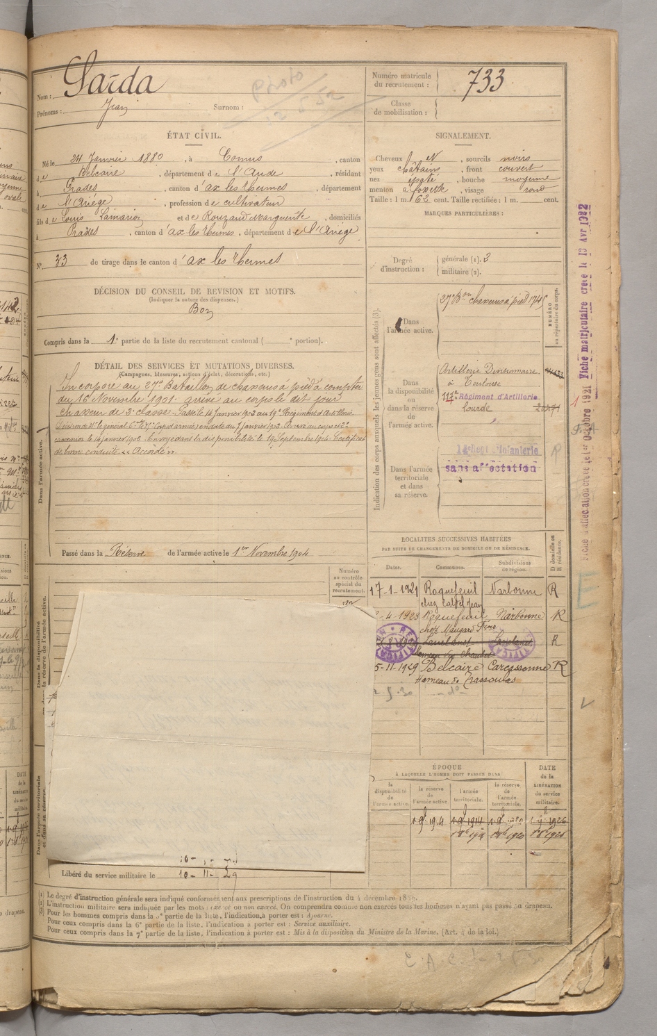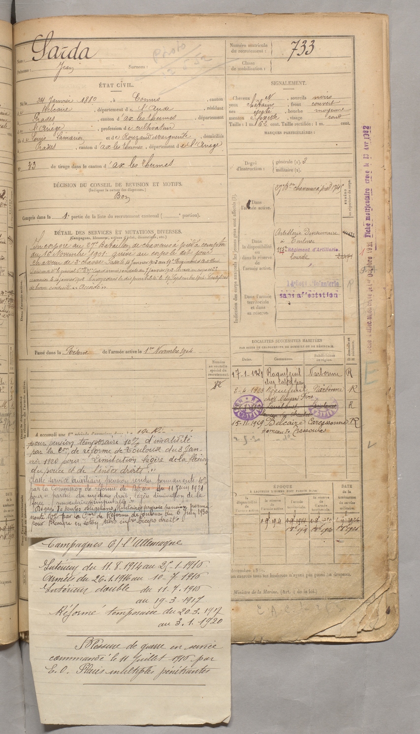 | Sarda | Jean | FOIX | 129 W 3 | 1900 | Comus | Prades | 733 |