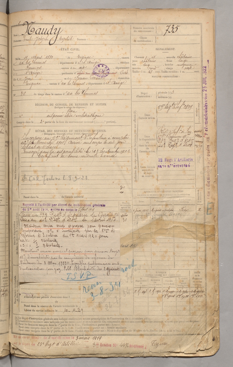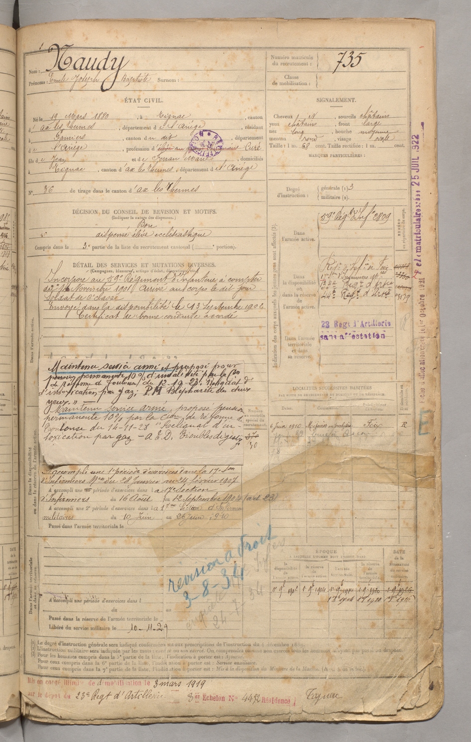 | Naudy | Emile Joseph Baptiste | FOIX | 129 W 3 | 1900 | Tignac | Pamiers | 735 |