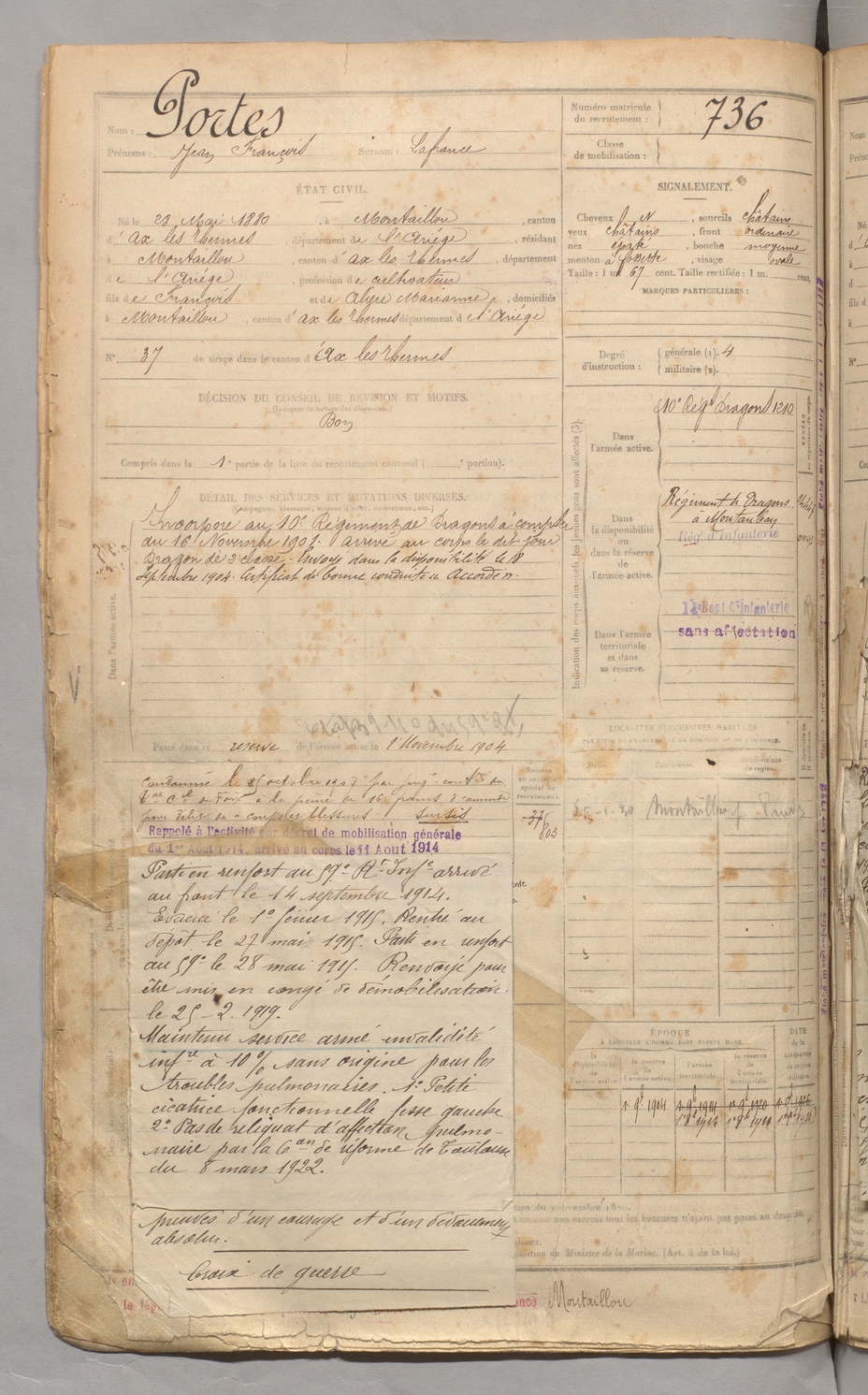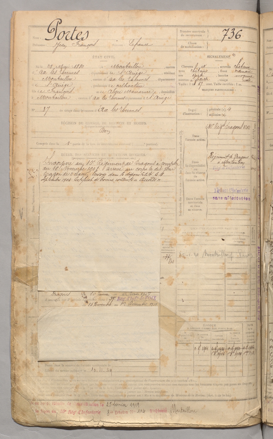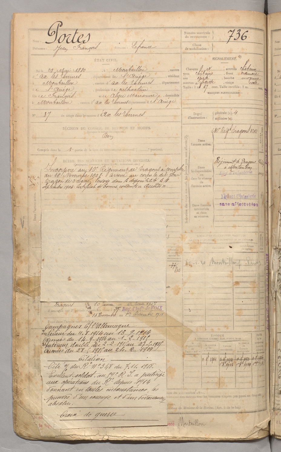 | Portes | Jean François dit Lafrance | FOIX | 129 W 3 | 1900 | Montaillou | Montaillou | 736 |
