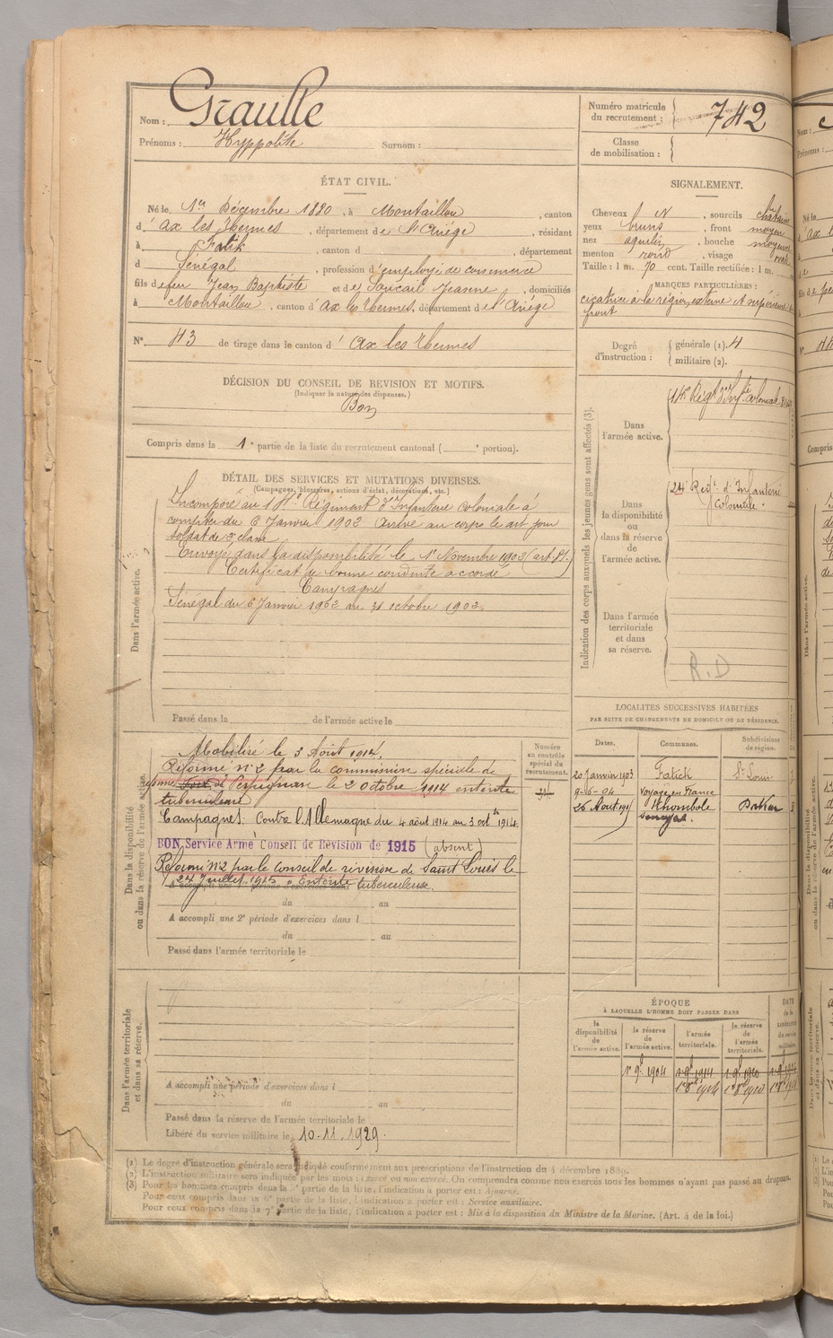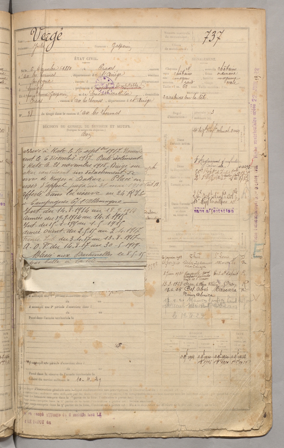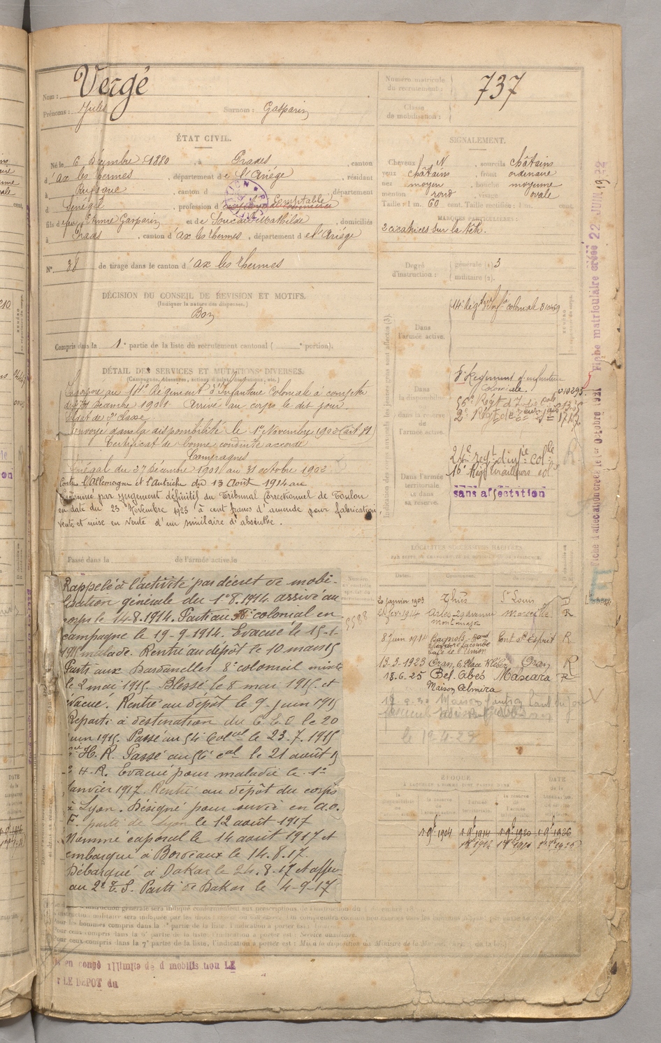 | Vergé | Jules dit Gasparin | FOIX | 129 W 3 | 1900 | Prades | Rufisque | 737 |