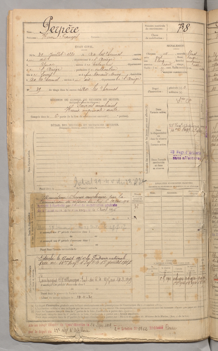 | Perpère | Henri François | FOIX | 129 W 3 | 1900 | Ax-les-Thermes | Unac | 738 |