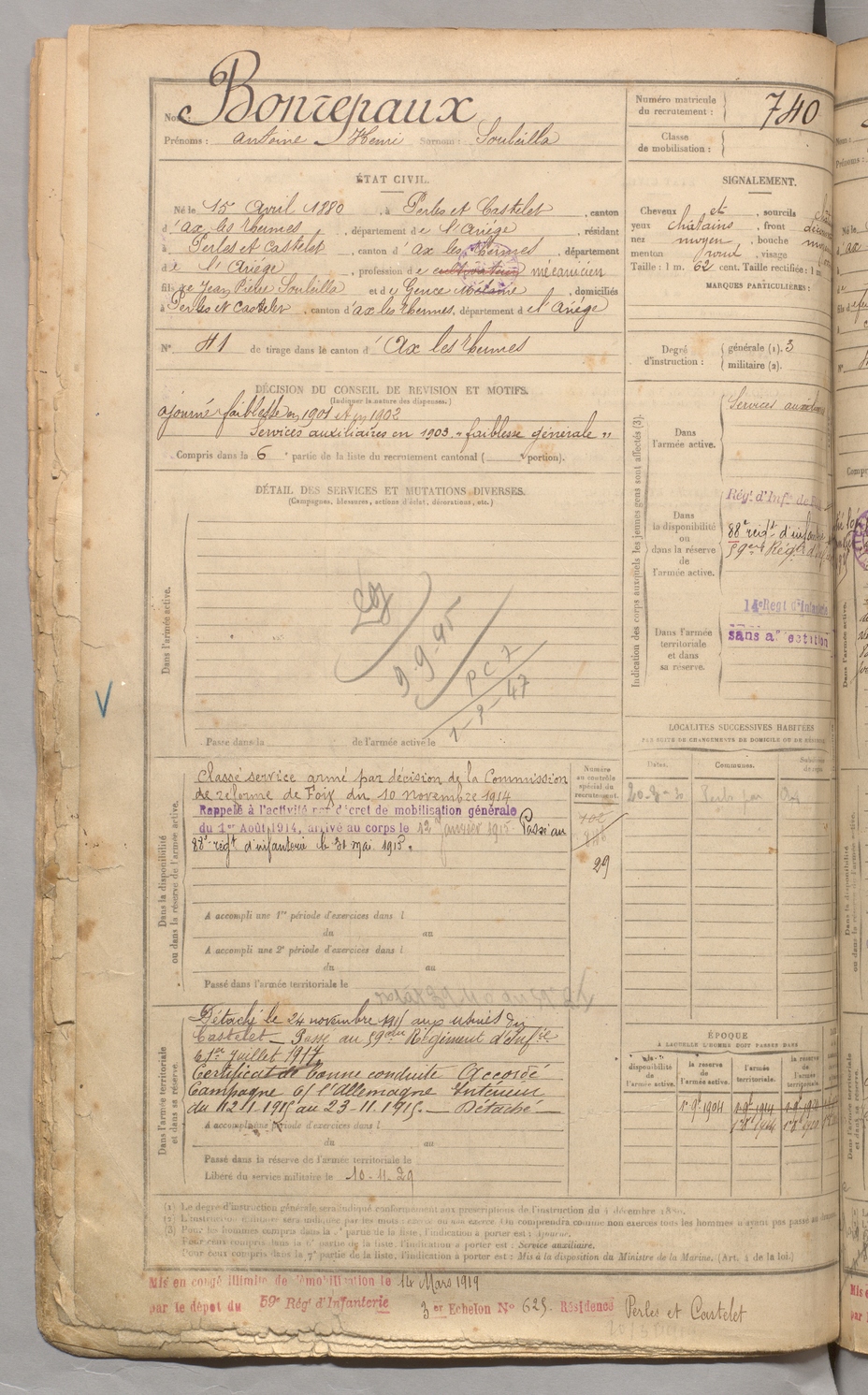 | Bonrepaux | Antoine Henri dit Souleilla | FOIX | 129 W 3 | 1900 | Perles-et-Castelet | Perles-et-Castelet | 740 |