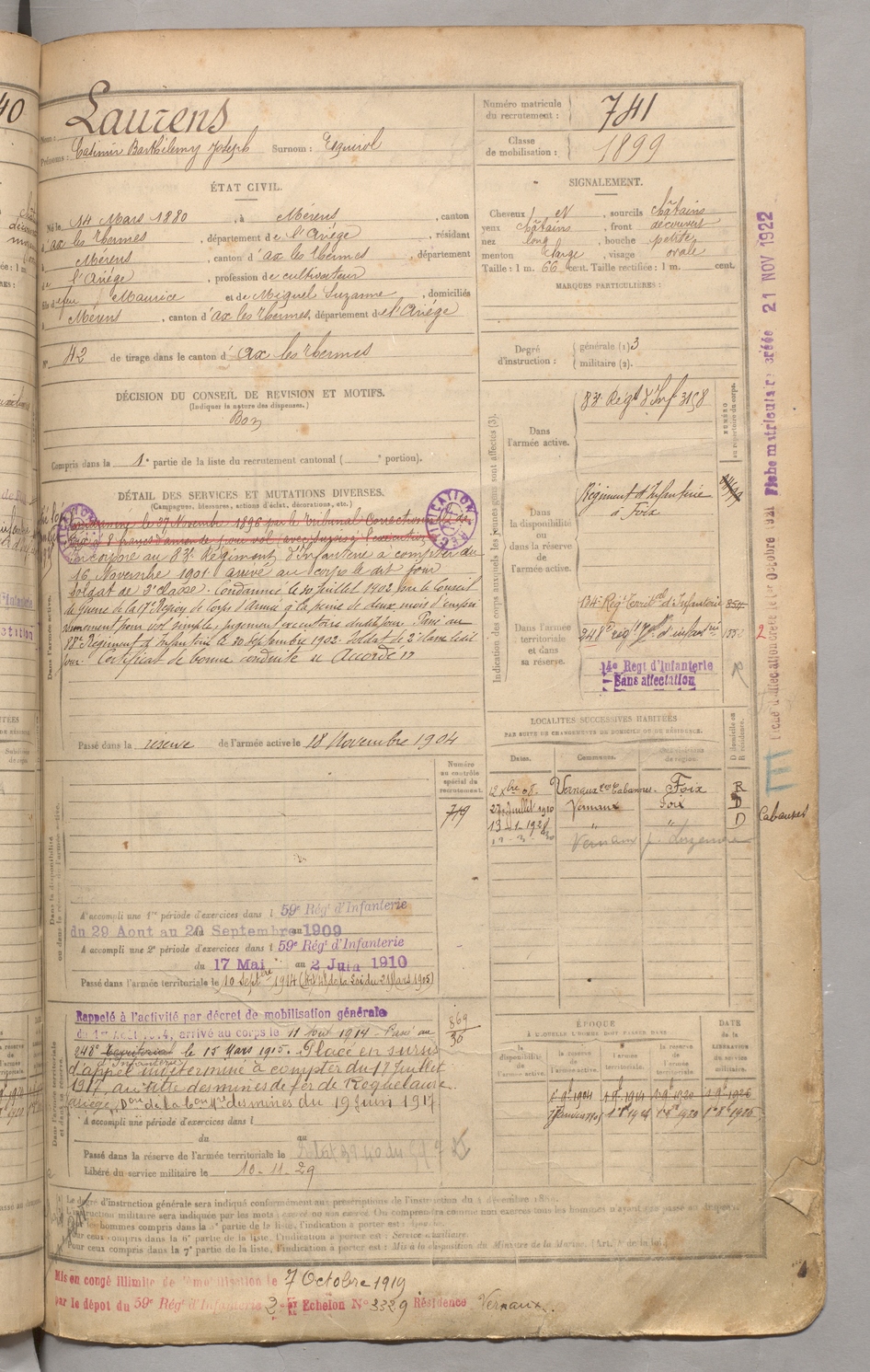 | Laurens | Casimir Barthélemy Joseph dit Esquirol | FOIX | 129 W 3 | 1900 | Mérens-les-Vals | Mérens-les-Vals | 741 |