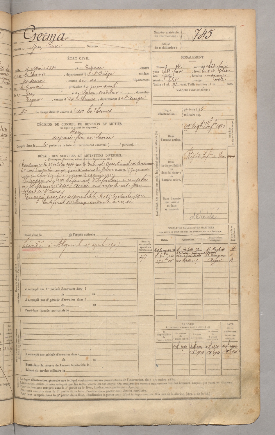 | Germa | Jean Pierre | FOIX | 129 W 3 | 1900 | Tignac | Bordeaux | 745 |