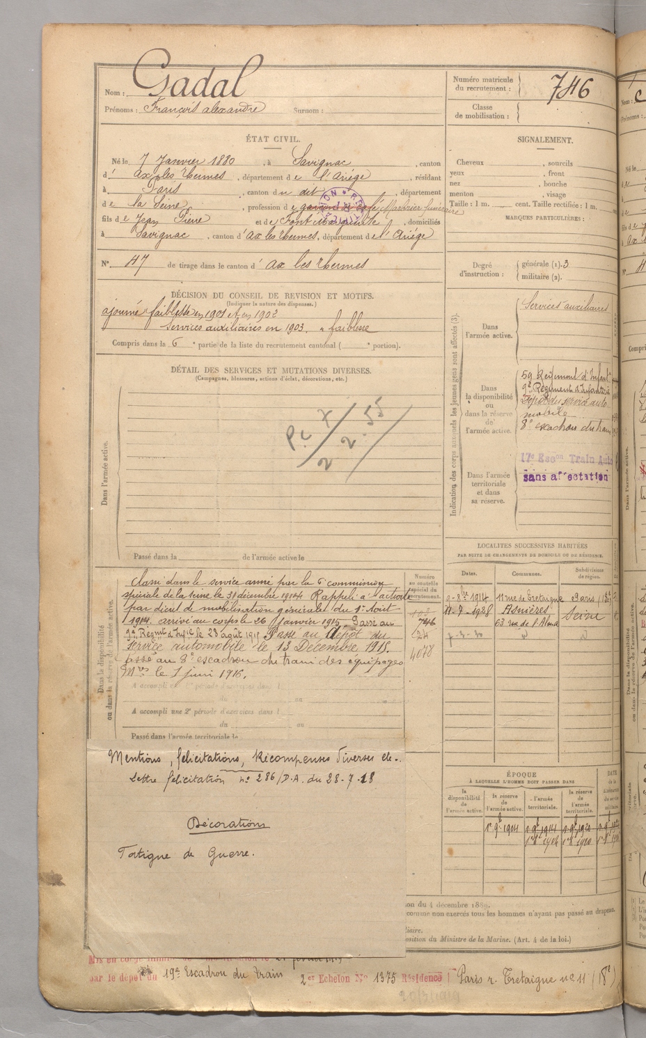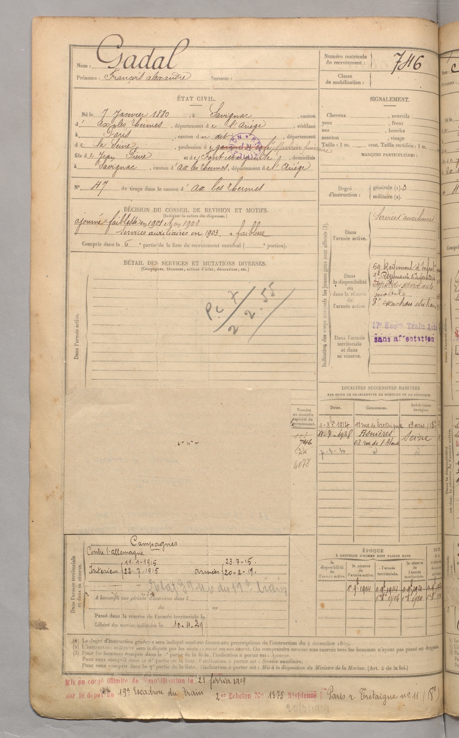 | Gadal | François Alexandre | FOIX | 129 W 3 | 1900 | Savignac-les-Ormeaux | Paris | 746 |