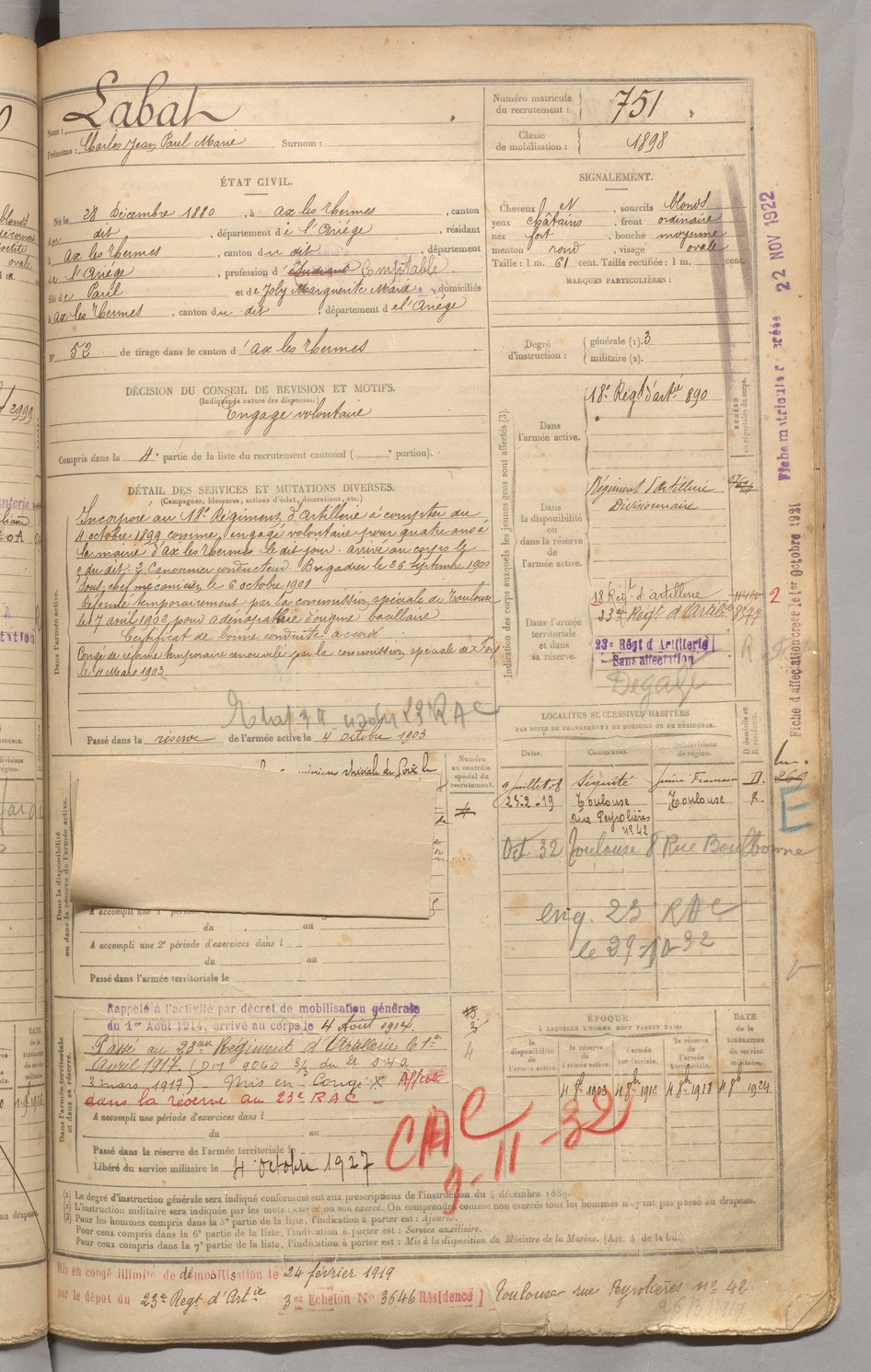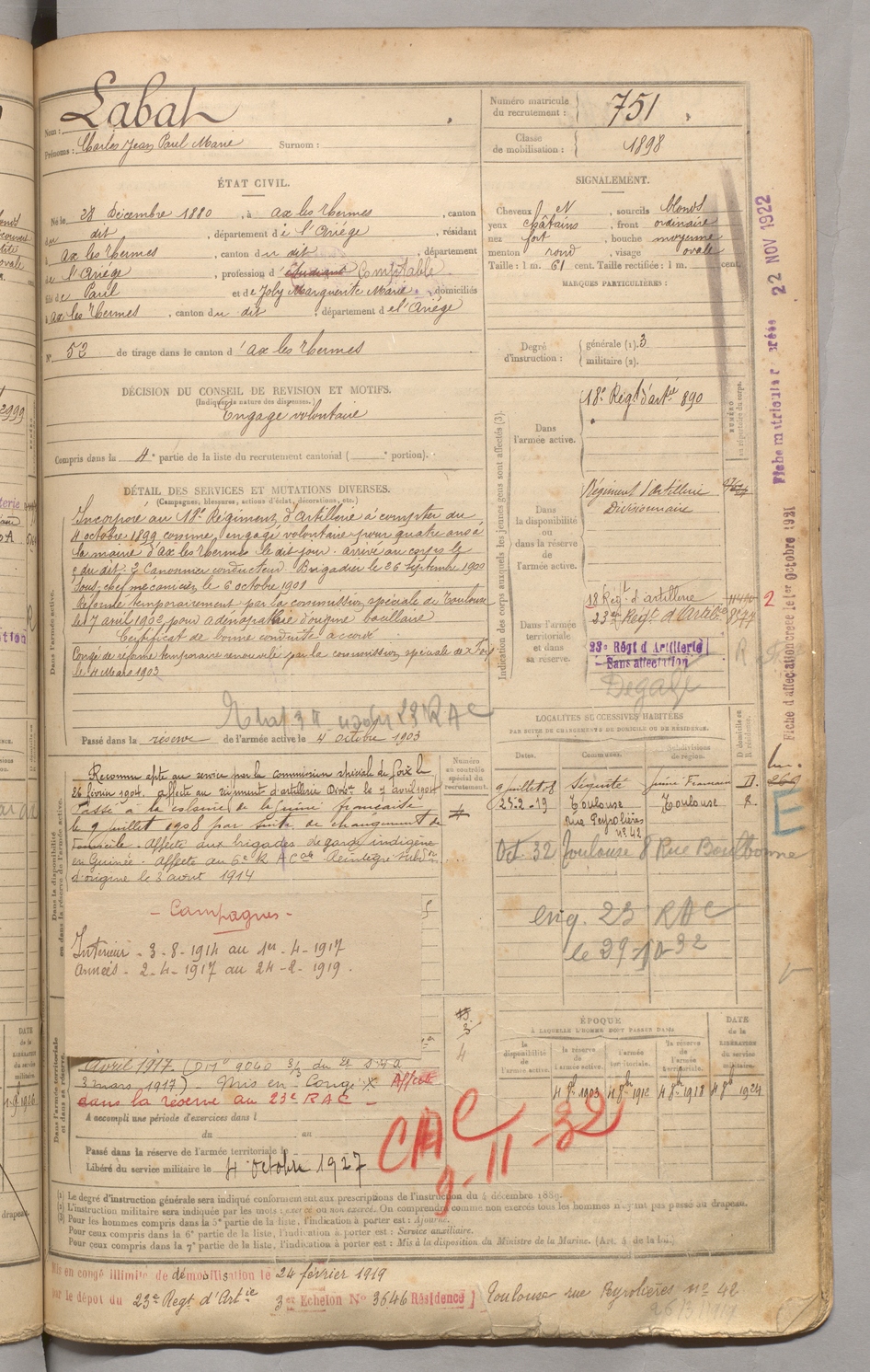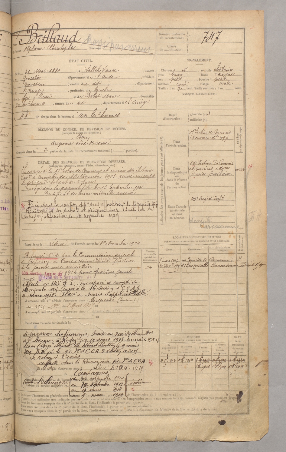 | Brillaud | Alphonse Christophe | FOIX | 129 W 3 | 1900 | Sallèles d'Aude | Tarascon | 747 |