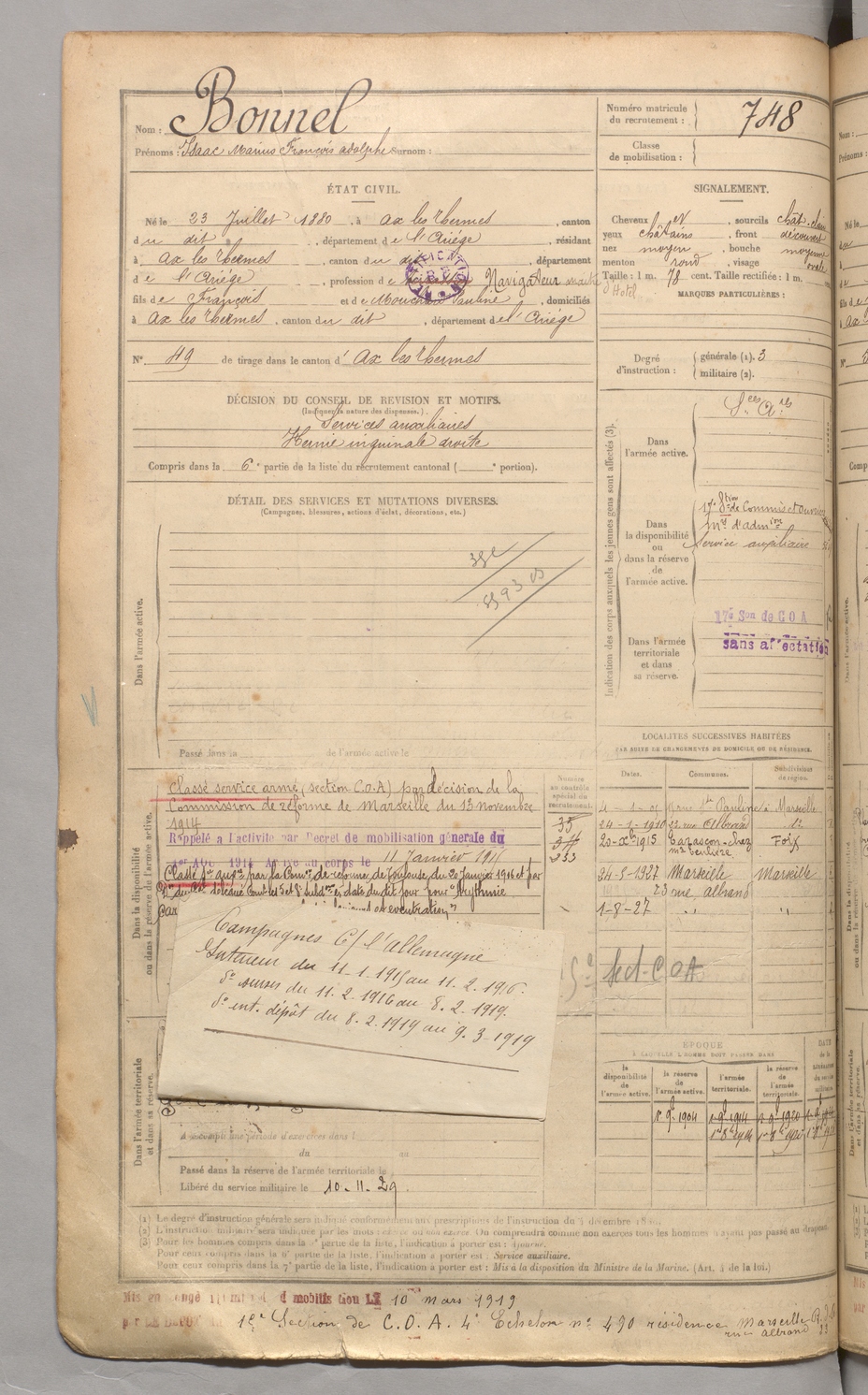 | Bonnel | Isaac Marius François Adolphe | FOIX | 129 W 3 | 1900 | Ax-les-Thermes | Ax-les-Thermes | 748 |