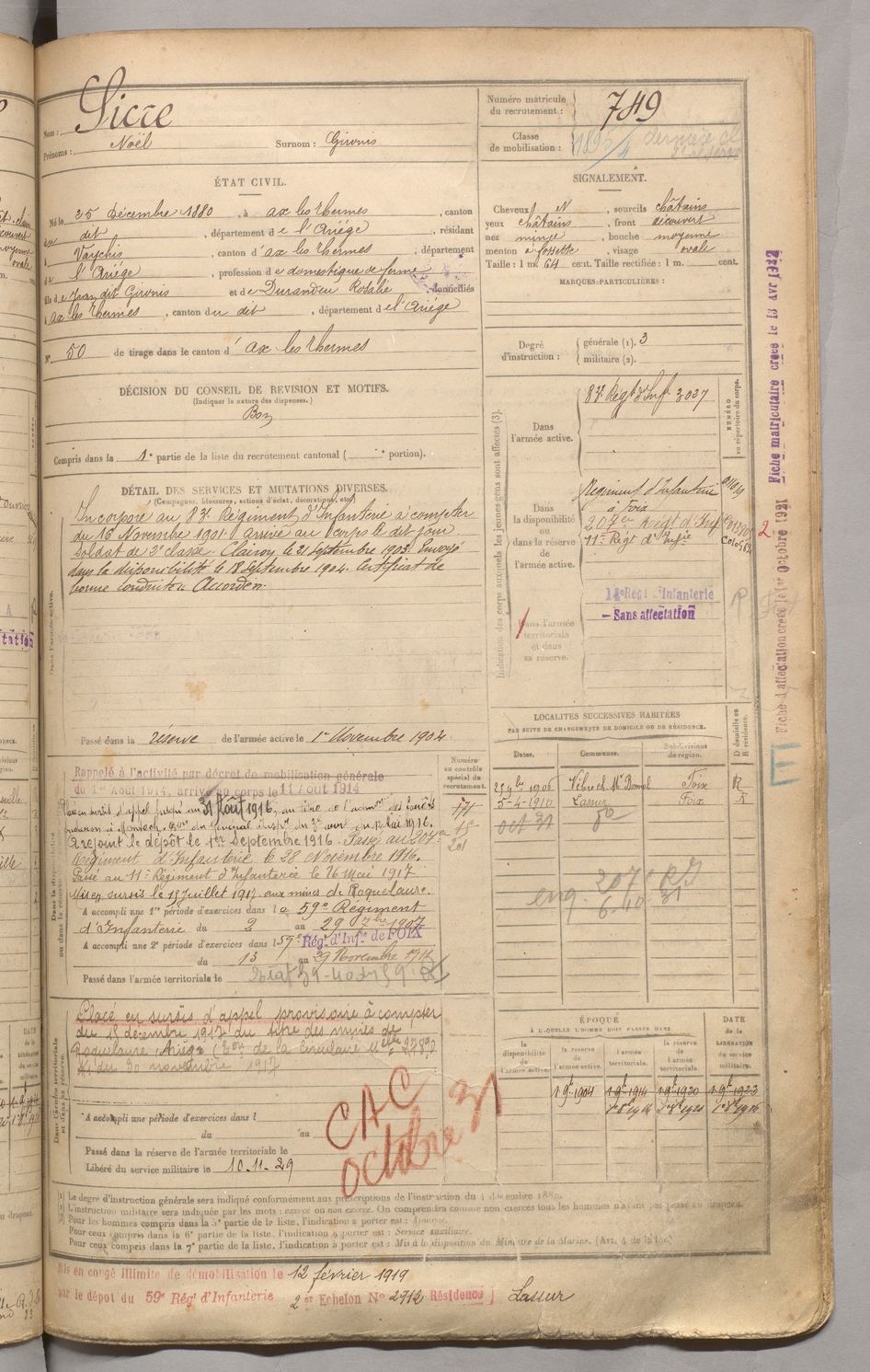 | Sicre | Noël dit Gironis | FOIX | 129 W 3 | 1900 | Ax-les-Thermes | Vaychis | 749 |