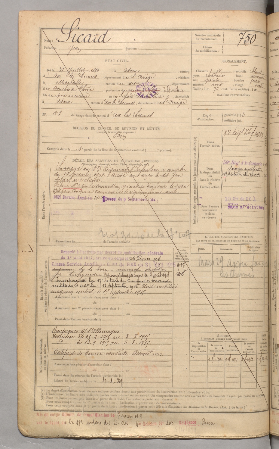 | Sicard | Jean | FOIX | 129 W 3 | 1900 | Ascou | Marseille | 750 |