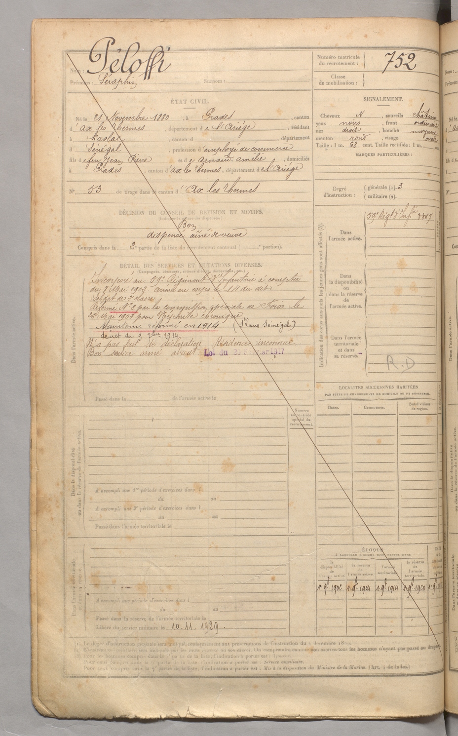| Péloffi | Séraphin | FOIX | 129 W 3 | 1900 | Prades | Kaolac | 752 |