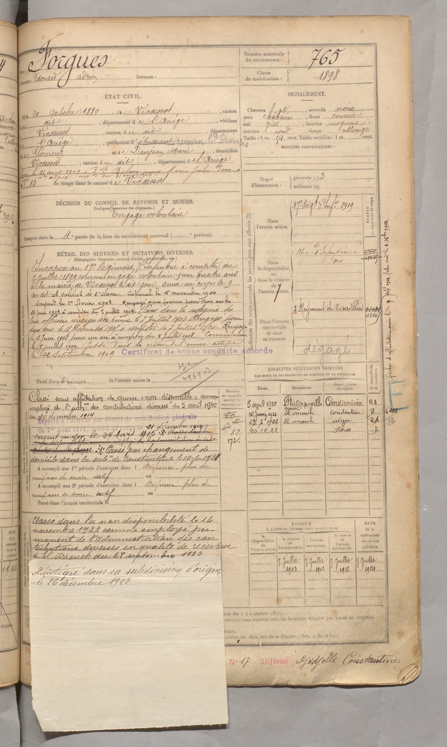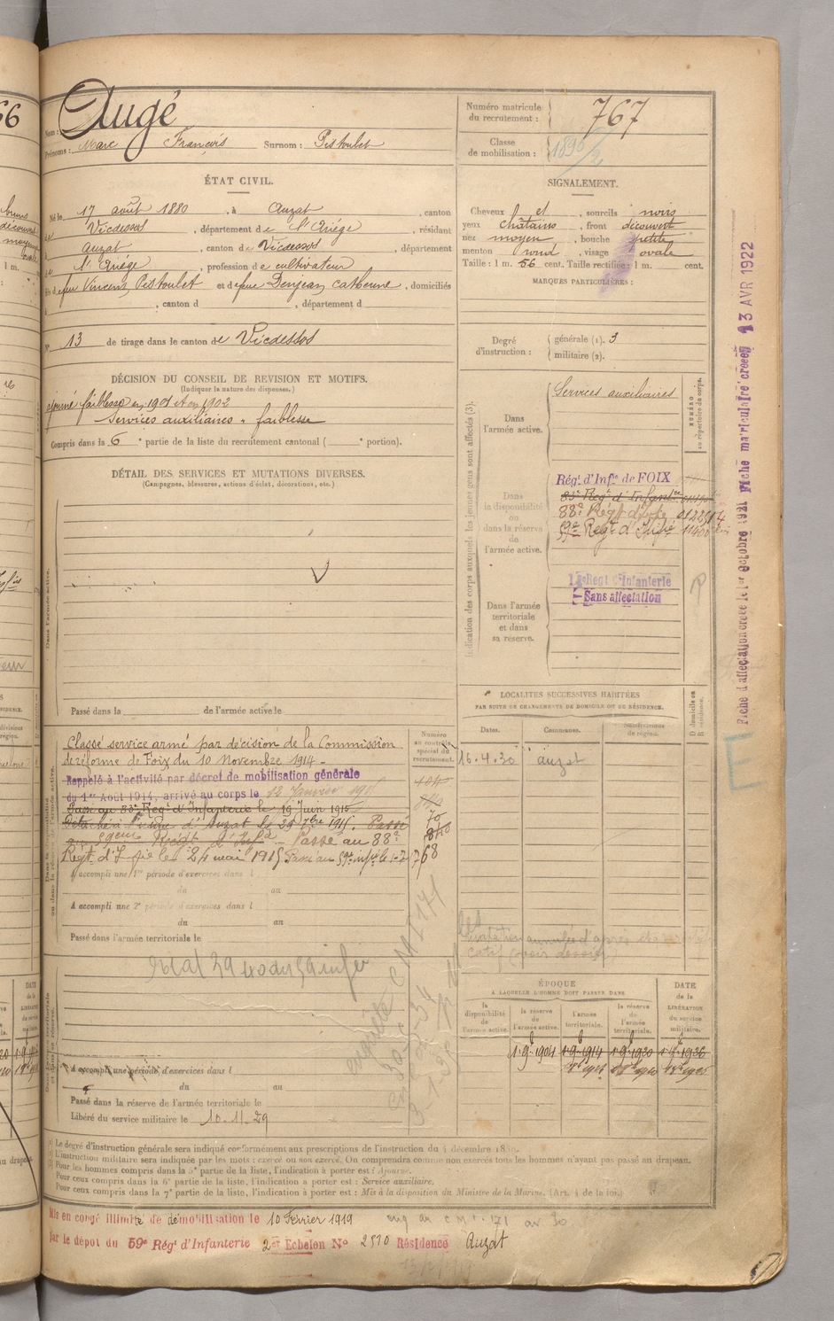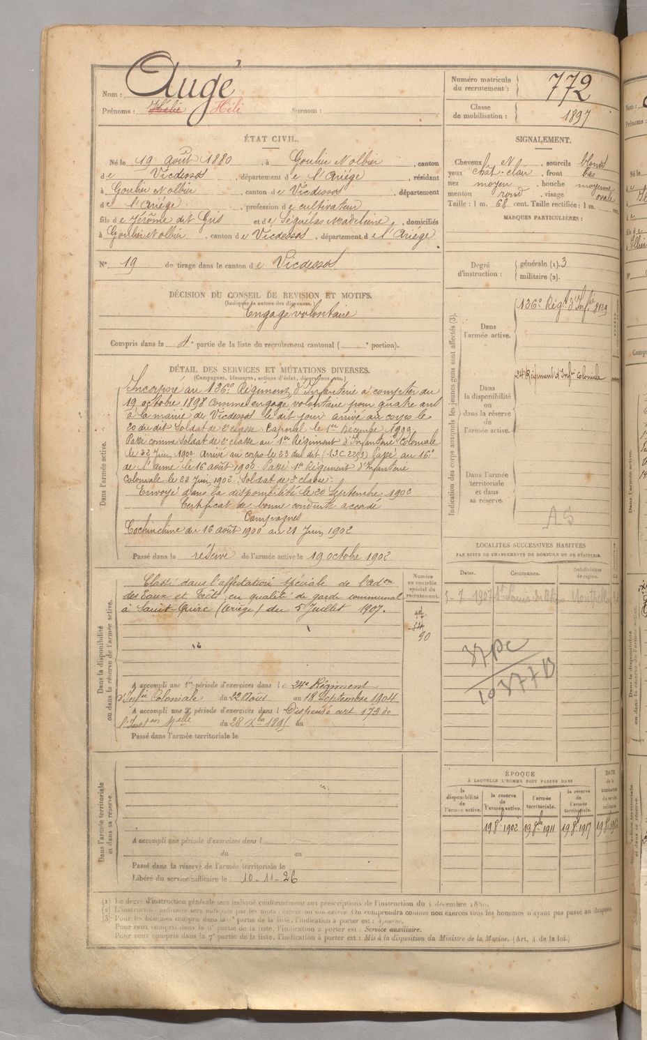 | Augé | Marc François dit Pistoulet | FOIX | 129 W 3 | 1900 | Auzat | Auzat | 767 |