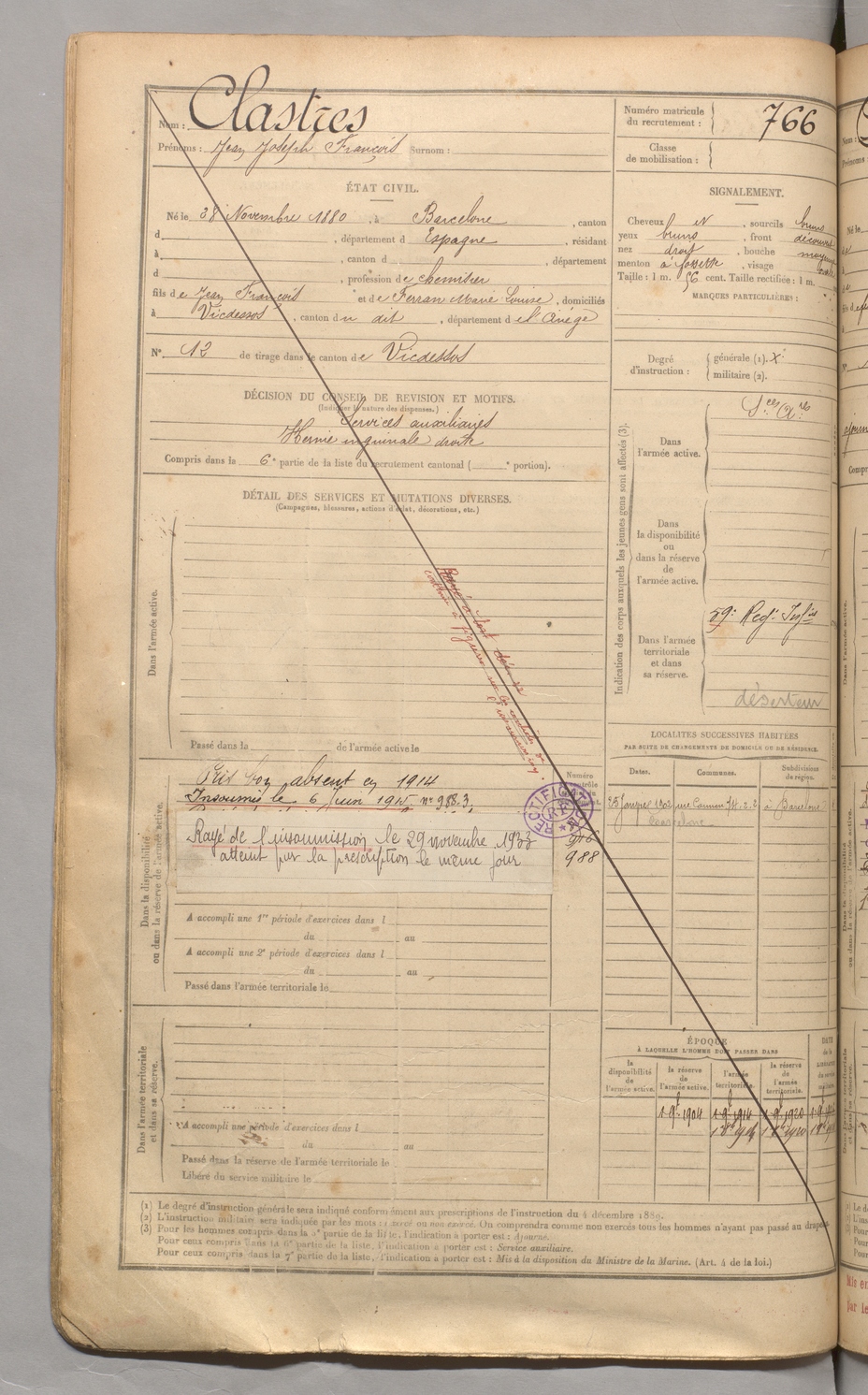 | Clastres | Jean Joseph François | FOIX | 129 W 3 | 1900 | Barcelone | 766 |