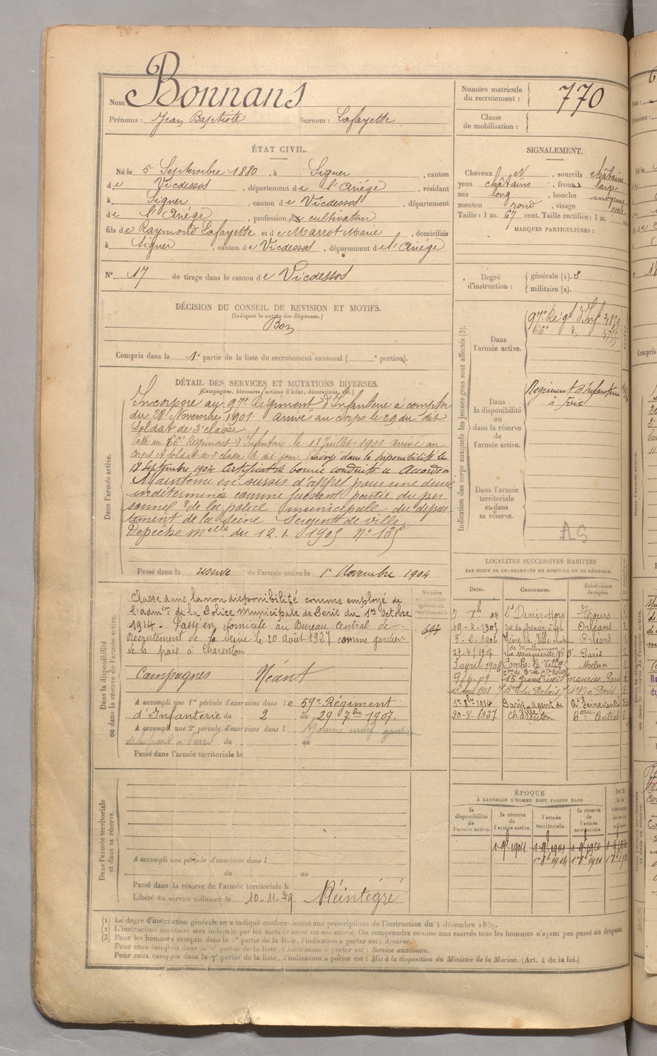 | Bonnans | Jean Baptiste dit Lafayette | FOIX | 129 W 3 | 1900 | Siguer | Siguer | 770 |
