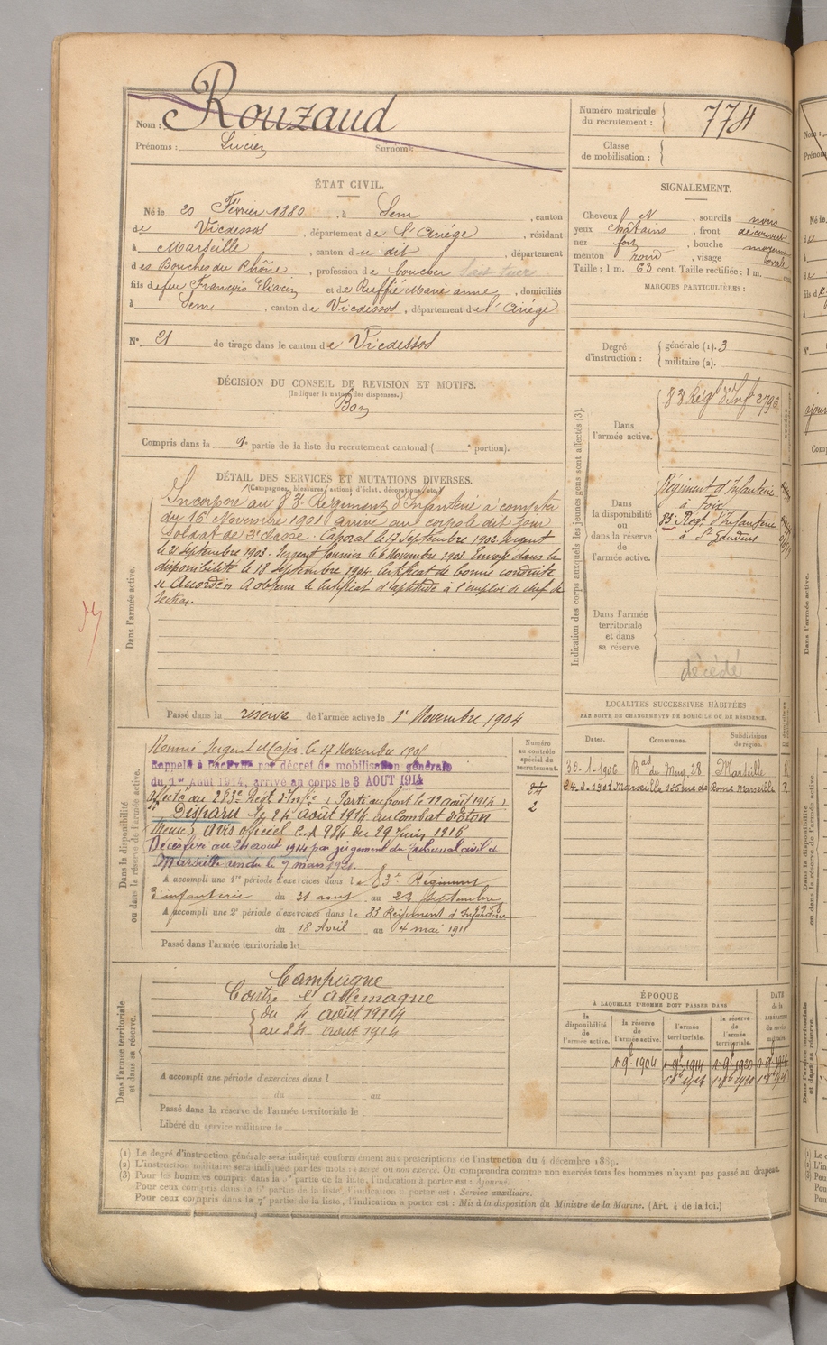 | Rouzaud | Lucien | FOIX | 129 W 3 | 1900 | Sem | Marseille | 774 |
