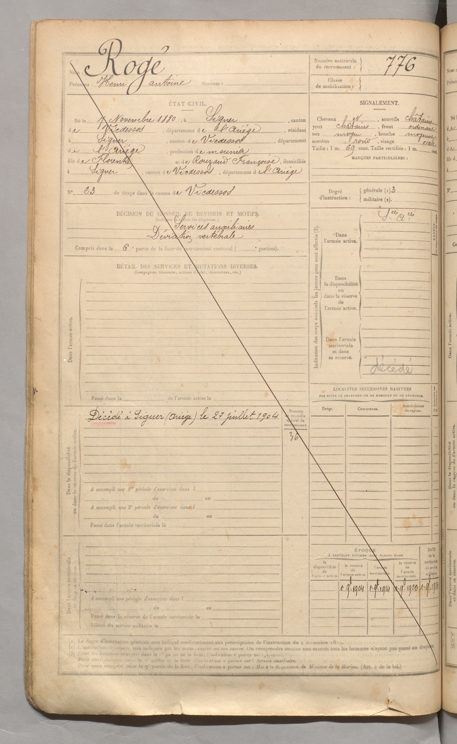 | Rogé | Henri Antoine | FOIX | 129 W 3 | 1900 | Siguer | Siguer | 776 |