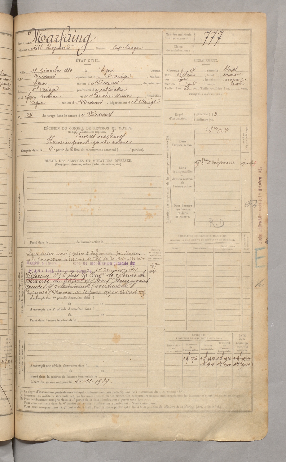 | Marfaing | Noël Raymond dit Cap Rouge | FOIX | 129 W 3 | 1900 | Siguer | Siguer | 777 |