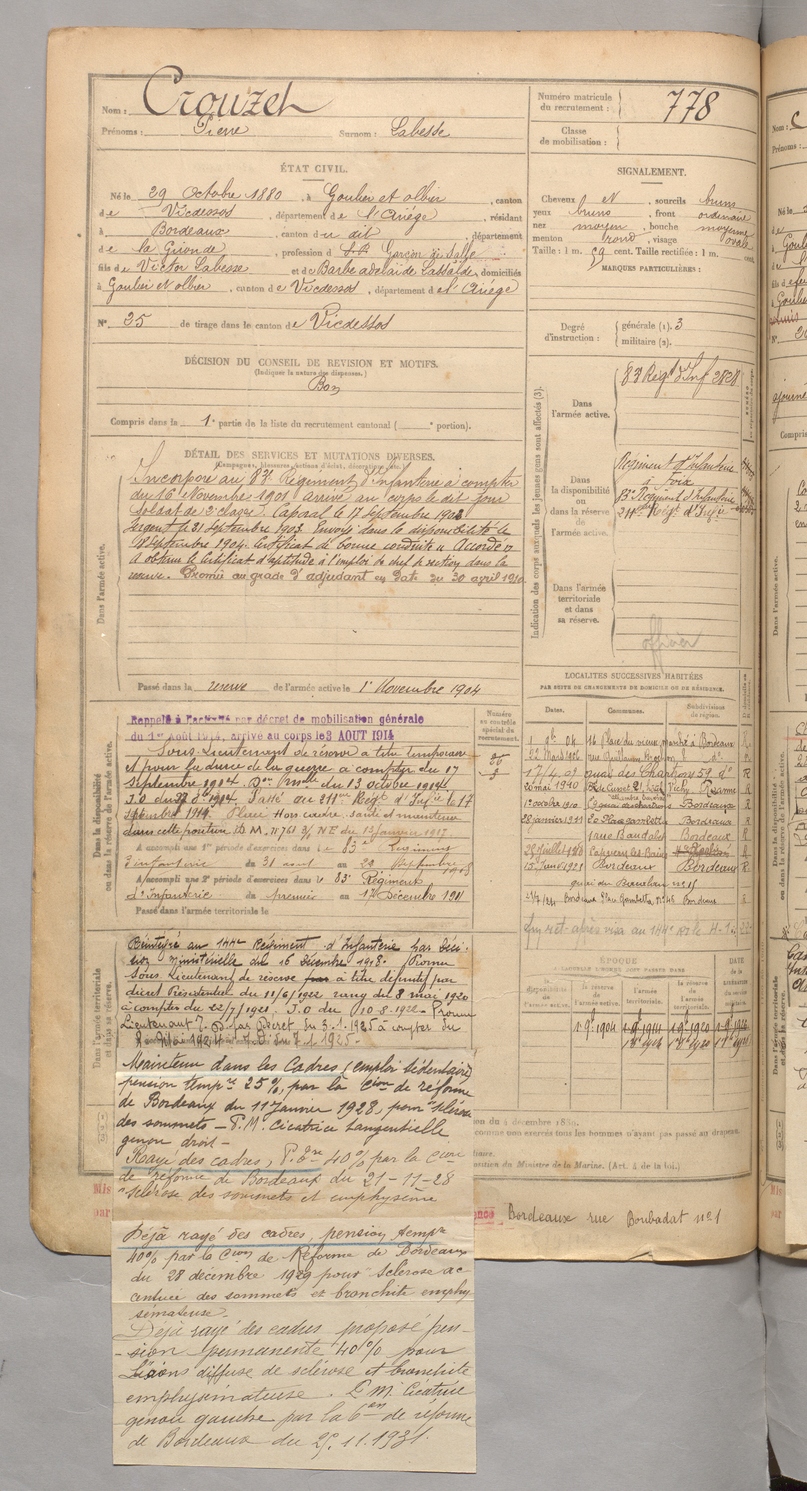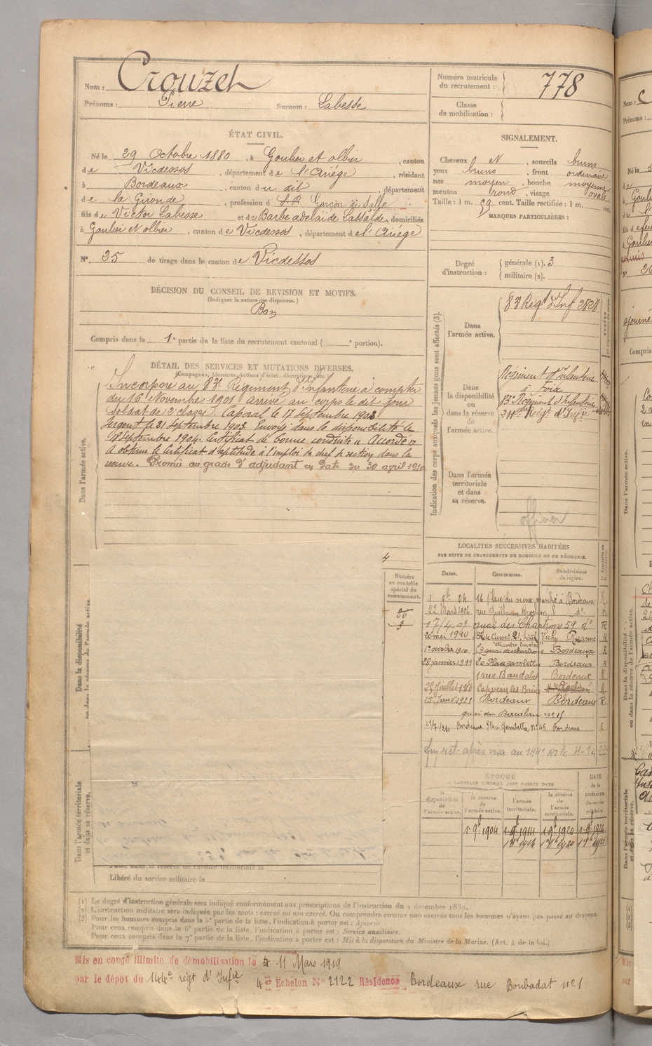 | Crouzet | Pierre dit Labesse | FOIX | 129 W 3 | 1900 | Goulier-Olbier | Bordeaux | 778 |
