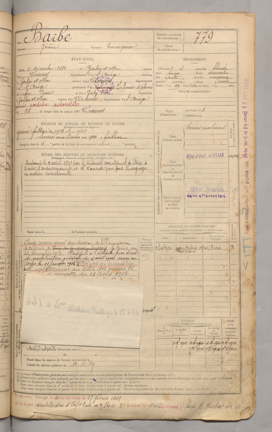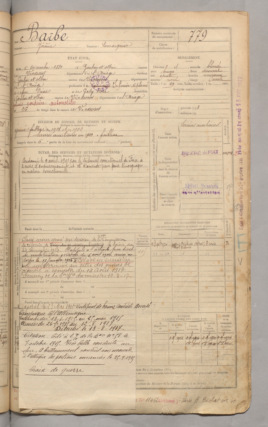 | Barbe | Jérôme dit Lamarquise | FOIX | 129 W 3 | 1900 | Goulier-Olbier | Goulier-Olbier | 779 |