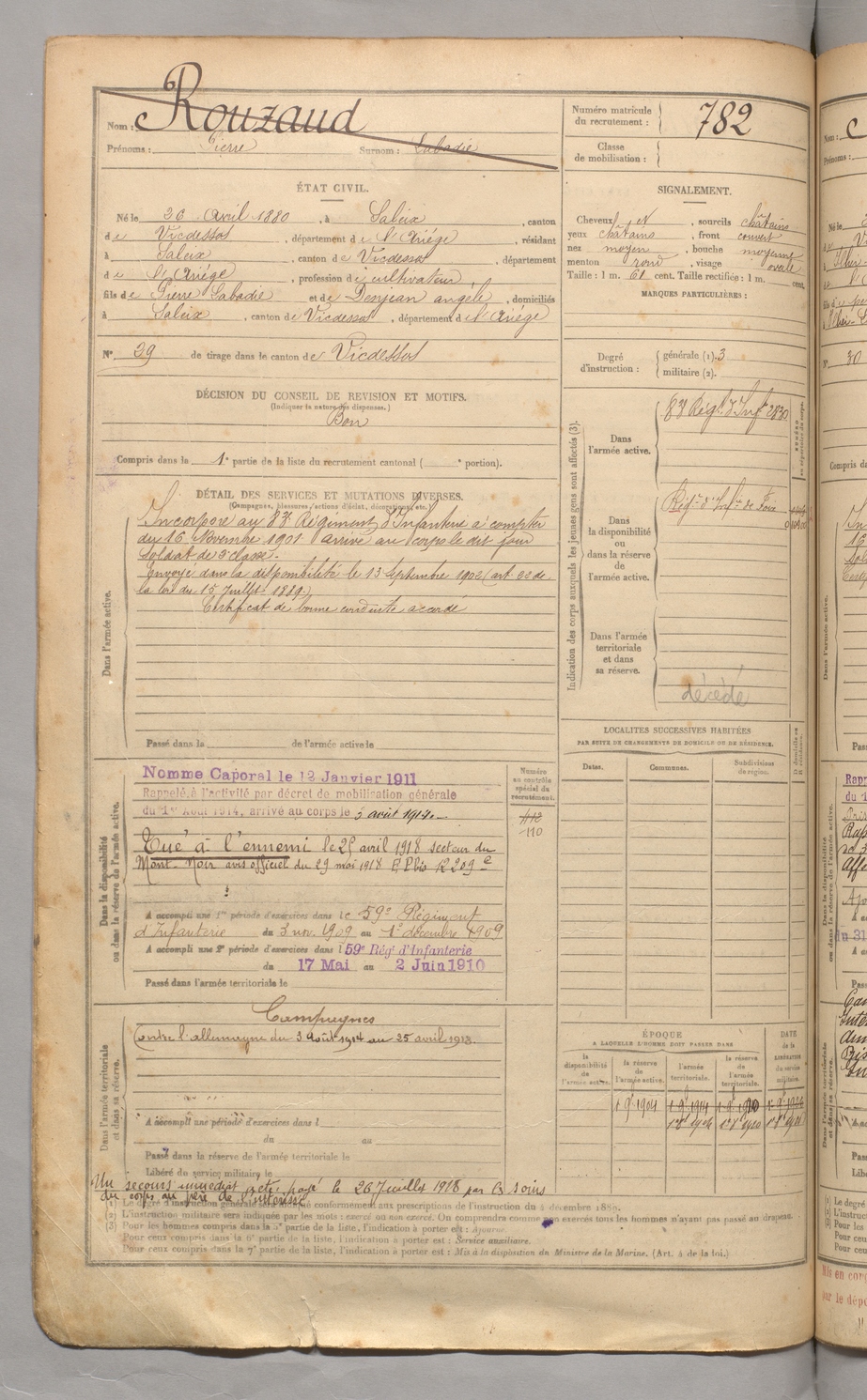 | Rouzaud | Pierre dit Labadie | FOIX | 129 W 3 | 1900 | Saleix | Saleix | 782 |