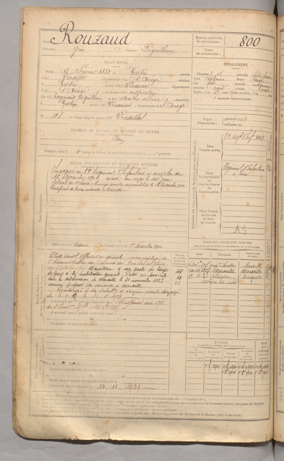 | Rouzaud | Jean dit Déguilhem | FOIX | 129 W 3 | 1900 | Gestiès | Gestiès | 800 |