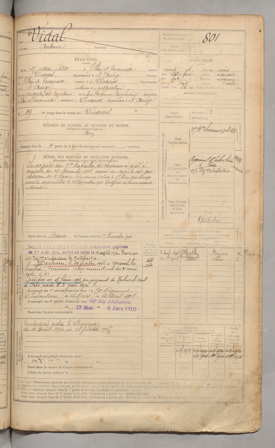 | Vidal | Antoine | FOIX | 129 W 3 | 1900 | Illier-Laramade | Illier-Laramade | 801 |