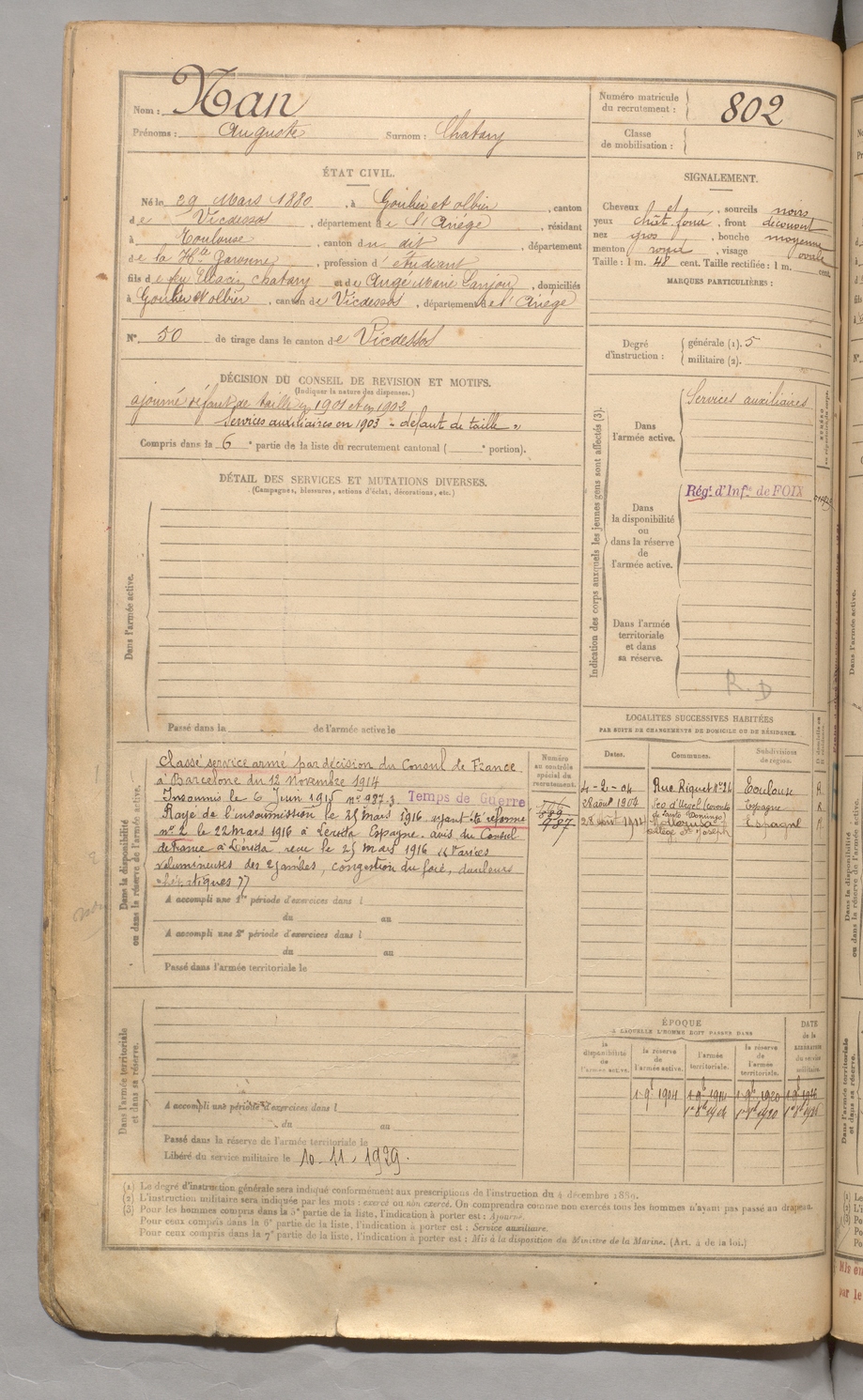 | Nan | Auguste dit Chatary | FOIX | 129 W 3 | 1900 | Goulier-Olbier | Toulouse | 802 |