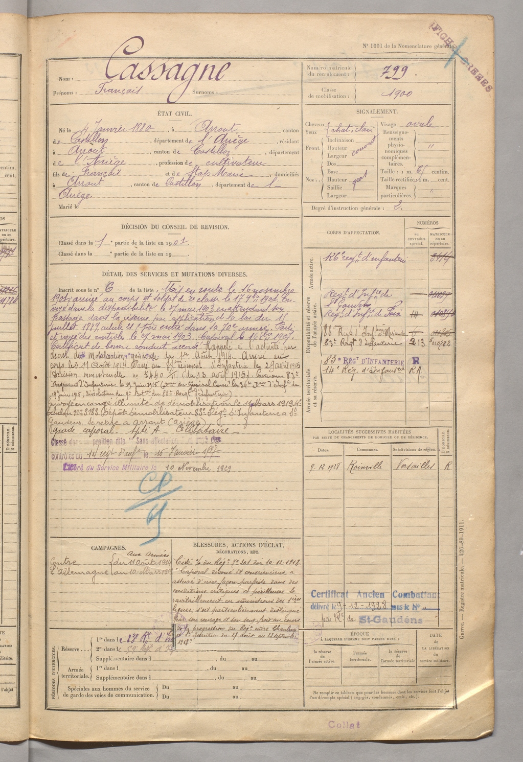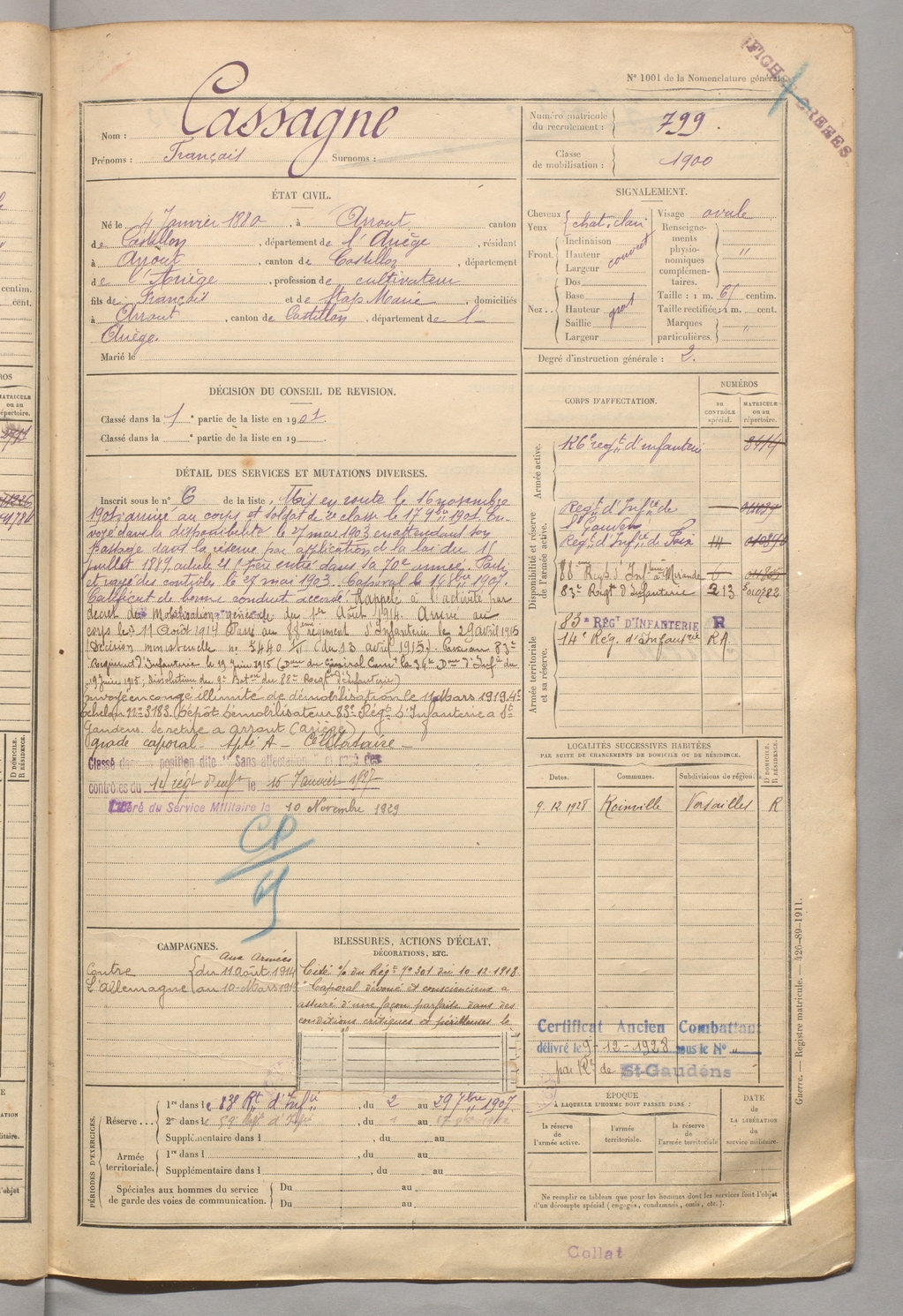 | Cassagne | François | FOIX | 129 W 5 | 1900 | Arrout | Arrout | 799 |