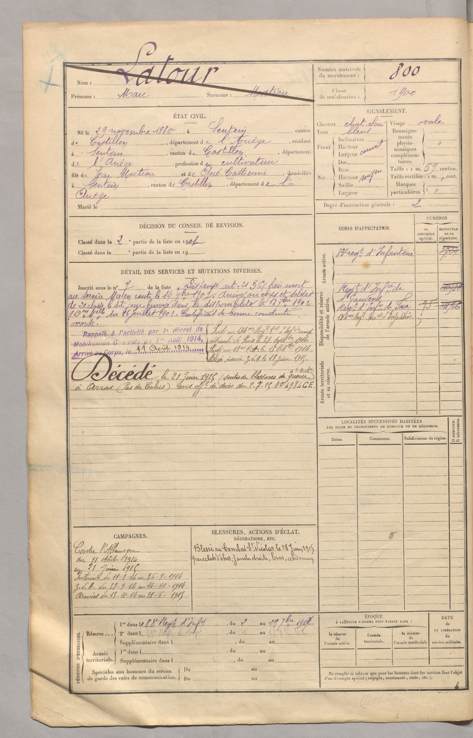 | Latour | Marc dit Matiou | FOIX | 129 W 5 | 1900 | Sentein | Sentein | 800 |