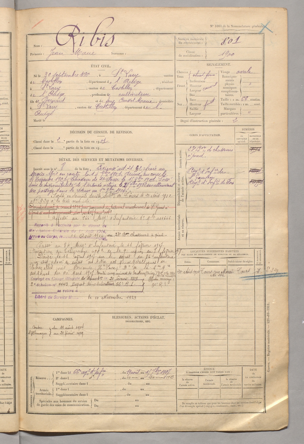 | Ribis | Jean Marie | FOIX | 129 W 5 | 1900 | Saint-Lary | Saint-Lary | 801 |