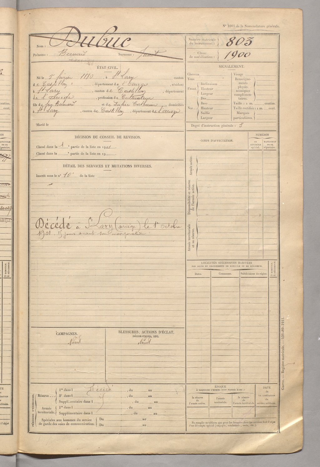 | Dubuc | Bernard dit Janot | FOIX | 129 W 5 | 1900 | Saint-Lary | Saint-Lary | 803 |