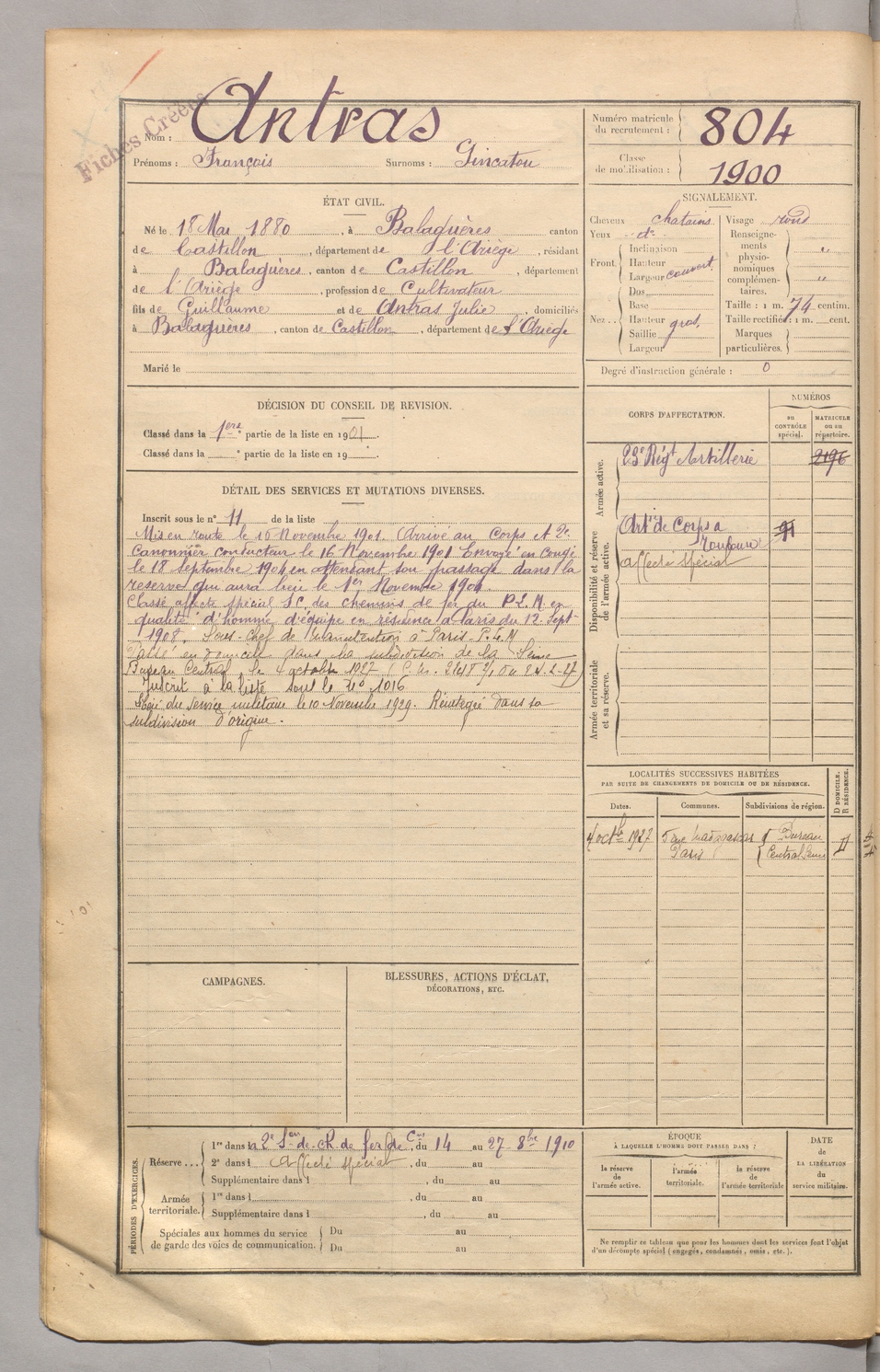 | Antras | François dit Sincatou | FOIX | 129 W 5 | 1900 | Balaguères | Balaguères | 804 |